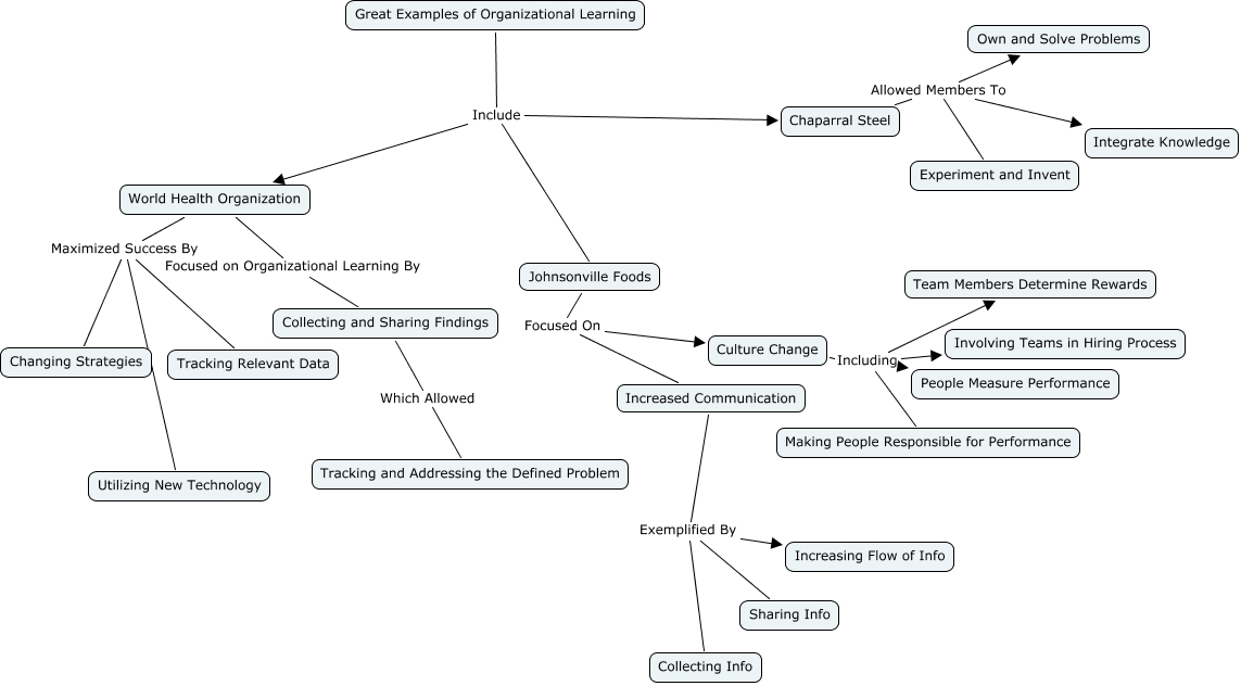 This Concept Map, created with IHMC CmapTools, has information related to: Megan Practice CMap, Great Examples of Organizational Learning Include World Health Organization, Culture Change Including Involving Teams in Hiring Process, Increased Communication Exemplified By Collecting Info, Chaparral Steel Allowed Members To Own and Solve Problems, Increased Communication Exemplified By Increasing Flow of Info, Chaparral Steel Allowed Members To Integrate Knowledge, Great Examples of Organizational Learning Include Johnsonville Foods, Great Examples of Organizational Learning Include Chaparral Steel, Collecting and Sharing Findings Which Allowed Tracking and Addressing the Defined Problem, Johnsonville Foods Focused On Culture Change, Increased Communication Exemplified By Sharing Info, World Health Organization Focused on Organizational Learning By Collecting and Sharing Findings, Culture Change Including Team Members Determine Rewards, World Health Organization Maximized Success By Changing Strategies, Culture Change Including Making People Responsible for Performance, World Health Organization Maximized Success By Tracking Relevant Data, Chaparral Steel Allowed Members To Experiment and Invent, Johnsonville Foods Focused On Increased Communication, Culture Change Including People Measure Performance, World Health Organization Maximized Success By Utilizing New Technology