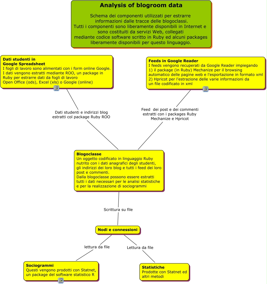 This Concept Map, created with IHMC CmapTools, has information related to: Blogroom, Blogoclasse Un oggetto codificato in linguaggio Ruby nutrito con i dati anagrafici degli studenti, gli indirizzi dei loro blog e tutti i feed dei loro post e commenti. Dalla blogoclasse possono essere estratti tutti i dati necessari per le analisi statistiche e per la realizzazione di sociogrammi Scrittura su file Nodi e connessioni, Feeds in Google Reader I feeds vengono recuperati da Google Reader impiegando 1) il package (in Ruby) Mechanize per il browsing automatico delle pagine web e l'esportazione in formato xml 2) Hpricot per l'estrazione delle varie informazioni da un file codificato in xml Feed dei post e dei commenti estratti con i packages Ruby Mechanize e Hpricot Blogoclasse Un oggetto codificato in linguaggio Ruby nutrito con i dati anagrafici degli studenti, gli indirizzi dei loro blog e tutti i feed dei loro post e commenti. Dalla blogoclasse possono essere estratti tutti i dati necessari per le analisi statistiche e per la realizzazione di sociogrammi, Nodi e connessioni Lettura da file Statistiche Prodotte con Statnet ed altri metodi, Dati studenti in Google Spreadsheet I fogli di lavoro sono alimentati con i form online Google. I dati vengono estratti mediante ROO, un package in Ruby per estrarre dati da fogli di lavoro Open Office (ods), Excel (xls) o Google (online) Dati studenti e indirizzi blog estratti col package Ruby ROO Blogoclasse Un oggetto codificato in linguaggio Ruby nutrito con i dati anagrafici degli studenti, gli indirizzi dei loro blog e tutti i feed dei loro post e commenti. Dalla blogoclasse possono essere estratti tutti i dati necessari per le analisi statistiche e per la realizzazione di sociogrammi, Nodi e connessioni lettura da file Sociogrammi Questi vengono prodotti con Statnet, un package del software statistico R