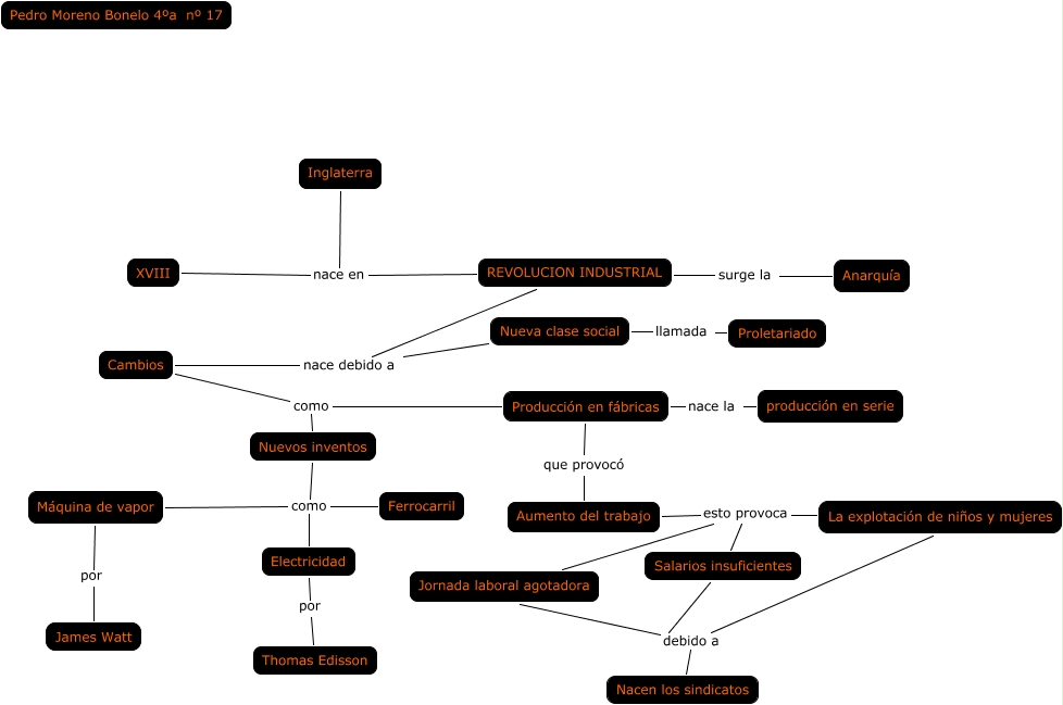 Este Cmap, tiene información relacionada con: REVOLUCION INDUSTRIAL 3, producción en serie nace la Producción en fábricas, Nuevos inventos como Electricidad, Nacen los sindicatos debido a Jornada laboral agotadora, Electricidad por Thomas Edisson, Nueva clase social llamada Proletariado, Nacen los sindicatos debido a La explotación de niños y mujeres, REVOLUCION INDUSTRIAL nace en XVIII, REVOLUCION INDUSTRIAL nace debido a Nueva clase social, Salarios insuficientes debido a La explotación de niños y mujeres, REVOLUCION INDUSTRIAL nace en Inglaterra, Aumento del trabajo esto provoca Salarios insuficientes, Producción en fábricas que provocó Aumento del trabajo, Nuevos inventos como Ferrocarril, Cambios como Producción en fábricas, Salarios insuficientes debido a Jornada laboral agotadora, Cambios como Nuevos inventos, REVOLUCION INDUSTRIAL surge la Anarquía, Aumento del trabajo esto provoca La explotación de niños y mujeres, Nuevos inventos como Máquina de vapor, Máquina de vapor por James Watt