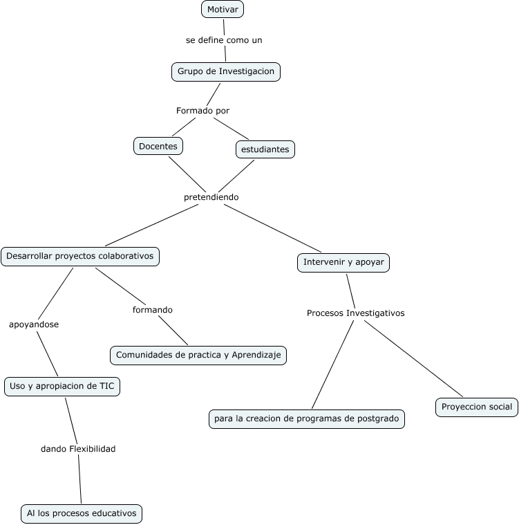 Este Cmap, tiene información relacionada con: Motivar Rouss, Intervenir y apoyar Procesos Investigativos Proyeccion social, estudiantes pretendiendo Desarrollar proyectos colaborativos, Docentes pretendiendo Intervenir y apoyar, Intervenir y apoyar Procesos Investigativos para la creacion de programas de postgrado, Docentes pretendiendo Desarrollar proyectos colaborativos, Uso y apropiacion de TIC dando Flexibilidad Al los procesos educativos, estudiantes pretendiendo Intervenir y apoyar, Grupo de Investigacion Formado por Docentes, Desarrollar proyectos colaborativos formando Comunidades de practica y Aprendizaje, Motivar se define como un Grupo de Investigacion, Desarrollar proyectos colaborativos apoyandose Uso y apropiacion de TIC, Grupo de Investigacion Formado por estudiantes