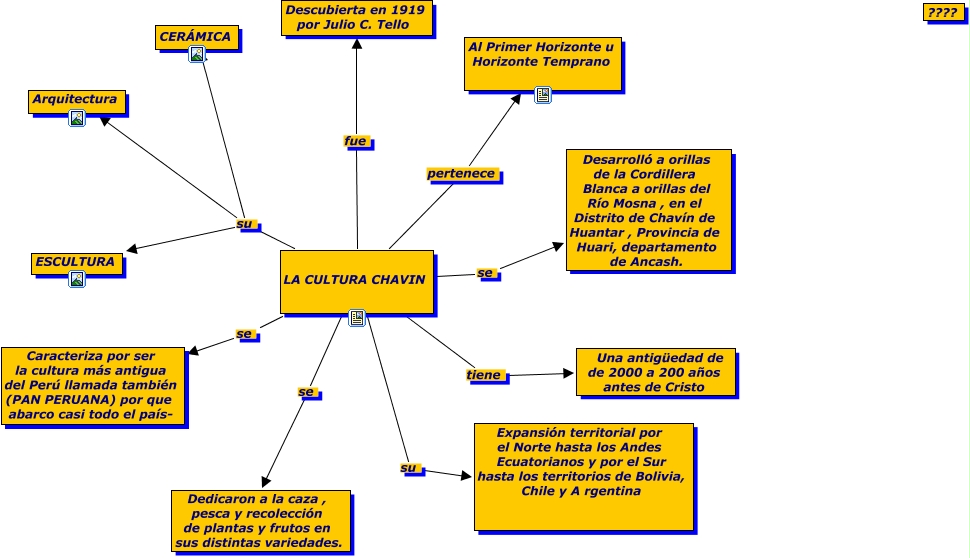 Este Cmap, tiene información relacionada con: La cultura chavin, LA CULTURA CHAVIN su CERÁMICA, LA CULTURA CHAVIN se Dedicaron a la caza , pesca y recolección de plantas y frutos en sus distintas variedades., LA CULTURA CHAVIN su Expansión territorial por el Norte hasta los Andes Ecuatorianos y por el Sur hasta los territorios de Bolivia, Chile y A rgentina, LA CULTURA CHAVIN su Arquitectura, LA CULTURA CHAVIN fue Descubierta en 1919 por Julio C. Tello, LA CULTURA CHAVIN se Desarrolló a orillas de la Cordillera Blanca a orillas del Río Mosna , en el Distrito de Chavín de Huantar , Provincia de Huari, departamento de Ancash., LA CULTURA CHAVIN tiene Una antigüedad de de 2000 a 200 años antes de Cristo, LA CULTURA CHAVIN su ESCULTURA, LA CULTURA CHAVIN se Caracteriza por ser la cultura más antigua del Perú llamada también (PAN PERUANA) por que abarco casi todo el país-, LA CULTURA CHAVIN pertenece Al Primer Horizonte u Horizonte Temprano