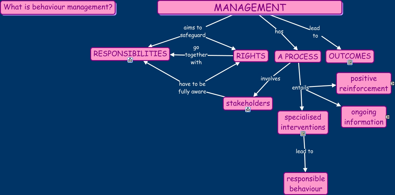 Esse mapa conceitual, produzido no IHMC CmapTools, tem a informação relacionada a: pres, positive reinforcements are recognised through certificates, A PROCESS involves stakeholders, A PROCESS entails ongoing information, RIGHTS go together with RESPONSIBILITIES, MANAGEMENT has A PROCESS, ongoing information such as through PPPs, ongoing information such as through Visuals, positive reinforcements are recognised through phone calls to parents, A PROCESS entails specialised interventions, positive reinforcements are recognised through assemblies, specialised interventions lead to responsible behaviour, stakeholders have to be fully aware RIGHTS, positive reinforcements are recognised through student skills, ongoing information such as through PSHE, stakeholders have to be fully aware RESPONSIBILITIES, ongoing information such as through assemblies, ongoing information such as through student skills, MANAGEMENT lead to OUTCOMES, MANAGEMENT aims to safeguard RESPONSIBILITIES, MANAGEMENT aims to safeguard RIGHTS