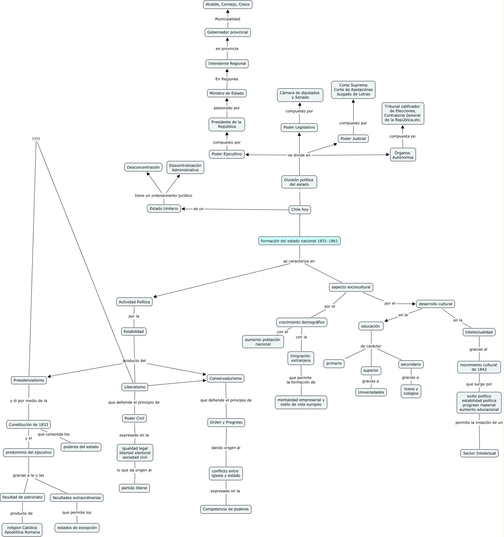 Este Cmap, tiene información relacionada con: Carola Andrea 2, Imigración extranjera que permite la formación de mentalidad empresarial y estilo de vida europeo, Orden y Progreso dando origen al conflicto entre iglesia y estado, Presidencialismo y él por medio de la Constitución de 1833, Poder Civil expresado en la igualdad legal libertad electoral sociedad civil, Presidencialismo ???? Liberalismo, Poder Legislativo compuesto por Cámara de diputados y Senado, desarrollo cultural en la educación, predominio del ejecutivo gracias a la o las facultades extraordinarias, Chile hoy División política del estado, educación de carácter superior, secundario gracias a liceos y colegios, Estabilidad producto del Presidencialismo, formación del estado nacional 1831-1861 se caracteriza en aspecto sociocultural, Conservadurismo que defiende el principio de Orden y Progreso, crecimiento demográfico con el aumento población nacional, aspecto sociocultural por el desarrollo cultural, Poder Judicial compuesto por Corte Suprema Corte de Apelaciónes Juzgado de Letras, División política del estado se divide en Poder Legislativo, Poder Ejecuttivo compuesto por Presidente de la República, aspecto sociocultural por el crecimiento demográfico