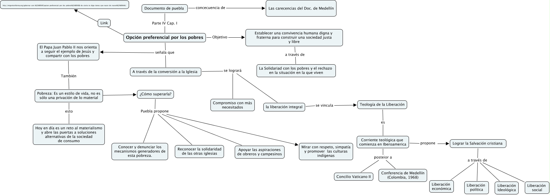 Este Cmap, tiene información relacionada con: Op preferencial final, Opción preferencial por los pobres ???? http://migenteinforma.org/gobernar-con-%E2%80%9Copcion-preferencial-por-los-pobres%E2%80%9D-de-cierto-te-digo-tienes-que-nacer-de-nuevo%E2%80%A6/, Lograr la Salvación cristiana a través de Liberación Ideológica, Corriente teológica que comienza en Iberoamerica posteior a Concilio Vaticano II, Opción preferencial por los pobres señala que El Papa Juan Pablo II nos orienta a seguir el ejemplo de Jesús y compartr con los pobres, Documento de puebla concecuencia de Las carecencias del Doc. de Medellín, A través de la conversión a la Iglesia se logrará la liberación integral, Corriente teológica que comienza en Iberoamerica propone Lograr la Salvación cristiana, Establecer una convivencia humana digna y fraterna para construir una sociedad justa y libre a través de La Solidariad con los pobres y el rechazo en la situación en la que viven, ¿Cómo superarla? Puebla propone Reconocer la solidaridad de las otras iglesias, Corriente teológica que comienza en Iberoamerica posteior a Conferencia de Medellín (Colombia, 1968), Opción preferencial por los pobres Objetivo Establecer una convivencia humana digna y fraterna para construir una sociedad justa y libre, Teología de la Liberación es Corriente teológica que comienza en Iberoamerica, ¿Cómo superarla? Puebla propone MIrar con respeto, simpatía y promover las culturas indígenas, Lograr la Salvación cristiana a través de Liberación económica, la liberación integral se vincula Teología de la Liberación, Lograr la Salvación cristiana a través de Liberación social, Pobreza: Es un estilo de vida, no es sólo una privación de lo material ???? ¿Cómo superarla?, ¿Cómo superarla? Puebla propone Apoyar las aspiraciones de obreros y campesinos, Documento de puebla Parte IV Cap. I Opción preferencial por los pobres, A través de la conversión a la Iglesia se logrará Compromiso con más necesitados