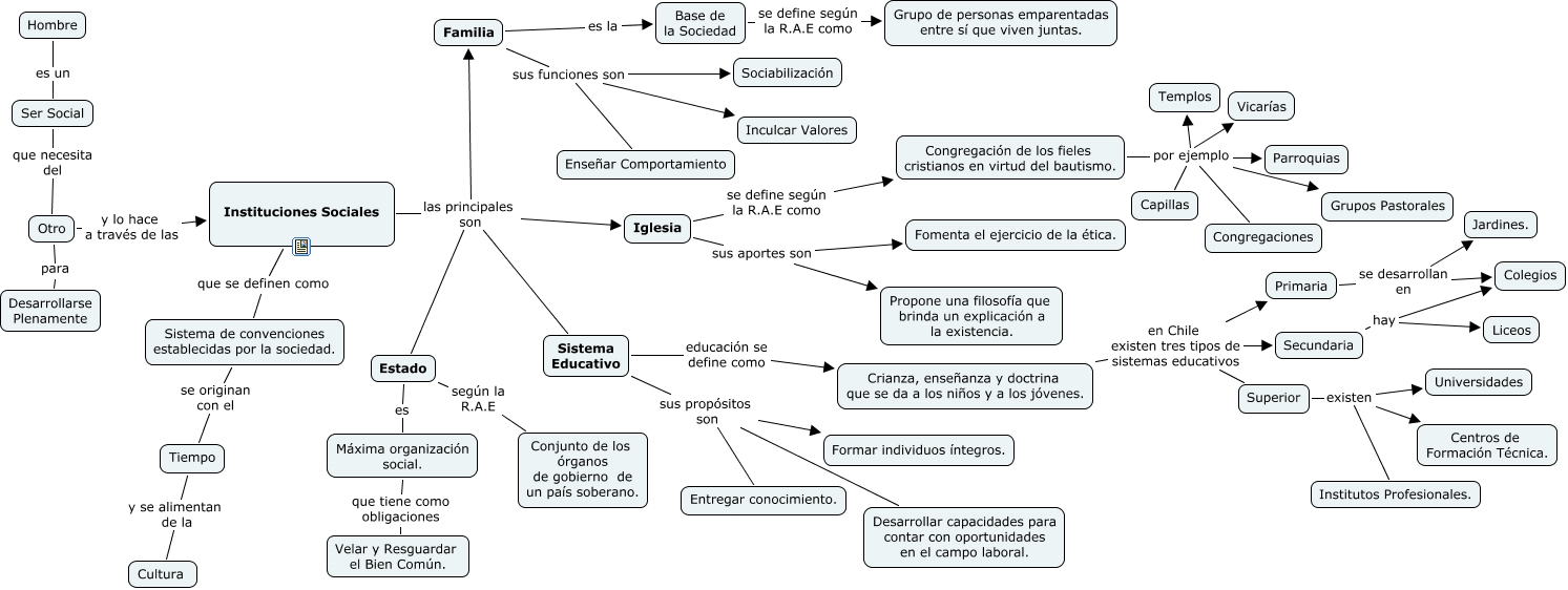 Este Cmap, tiene información relacionada con: Fernanda Orellana, Base de la Sociedad se define según la R.A.E como Grupo de personas emparentadas entre sí que viven juntas., Congregación de los fieles cristianos en virtud del bautismo. por ejemplo Congregaciones, Tiempo y se alimentan de la Cultura, Congregación de los fieles cristianos en virtud del bautismo. por ejemplo Templos, Hombre es un Ser Social, Secundaria hay Colegios, Otro y lo hace a través de las Instituciones Sociales, Secundaria hay Liceos, Superior existen Universidades, Crianza, enseñanza y doctrina que se da a los niños y a los jóvenes. en Chile existen tres tipos de sistemas educativos Primaria, Instituciones Sociales las principales son Familia, Congregación de los fieles cristianos en virtud del bautismo. por ejemplo Parroquias, Congregación de los fieles cristianos en virtud del bautismo. por ejemplo Grupos Pastorales, Instituciones Sociales las principales son Iglesia, Otro para Desarrollarse Plenamente, Sistema Educativo sus propósitos son Desarrollar capacidades para contar con oportunidades en el campo laboral., Máxima organización social. que tiene como obligaciones Velar y Resguardar el Bien Común., Iglesia se define según la R.A.E como Congregación de los fieles cristianos en virtud del bautismo., Familia sus funciones son Sociabilización, Congregación de los fieles cristianos en virtud del bautismo. por ejemplo Vicarías