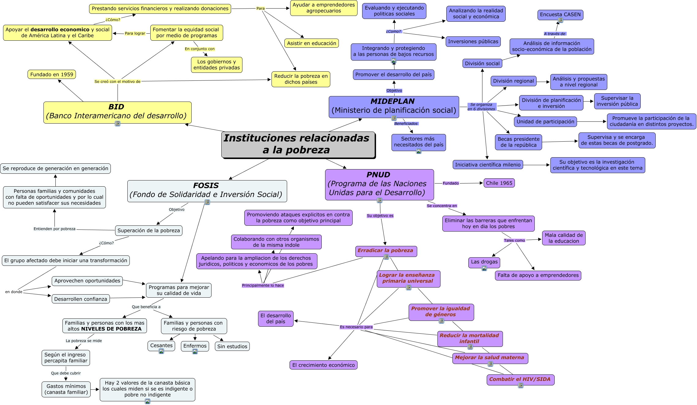 Este Cmap, tiene información relacionada con: Instituciones relacionadas, Eliminar las barreras que enfrentan hoy en dia los pobres Tales como Mala calidad de la educacion, Mejorar la salud materna ???? Combatir el HIV/SIDA, Superación de la pobreza Entienden por pobreza Personas familias y comunidades con falta de oportunidades y por lo cual no pueden satisfacer sus necesidades, División de planificación e inversión ???? Supervisar la inversión pública, Familias y personas con riesgo de pobreza ???? Enfermos, Prestando servicios financieros y realizando donaciones Para Reducir la pobreza en dichos países, Según el ingreso percapita familiar Que debe cubrir Gastos mínimos (canasta familiar), Iniciativa científica milenio ???? Su objetivo es la investigación científica y tecnológica en este tema, Apoyar el desarrollo economico y social de América Latina y el Caribe ¿Cómo? Prestando servicios financieros y realizando donaciones, BID (Banco Interamericano del desarrollo) ???? Fundado en 1959, Prestando servicios financieros y realizando donaciones Para Ayudar a emprendedores agropecuarios, BID (Banco Interamericano del desarrollo) Se creó con el motivo de Apoyar el desarrollo economico y social de América Latina y el Caribe, Prestando servicios financieros y realizando donaciones Para Asistir en educación, Erradicar la pobreza Principalmente lo hace Promoviendo ataques explicitos en contra la pobreza como objetivo principal, MIDEPLAN (Ministerio de planificación social) Se organiza en 6 divisiones División regional, Familias y personas con los mas altos NIVELES DE POBREZA La pobreza se mide Según el ingreso percapita familiar, Promover el desarrollo del país ???? Integrando y protegiendo a las personas de bajos recursos, MIDEPLAN (Ministerio de planificación social) Se organiza en 6 divisiones División de planificación e inversión, Promover la igualdad de géneros Es necesario para El desarrollo del país, Unidad de participación ???? Promueve la participación de la ciudadanía en distintos proyectos.