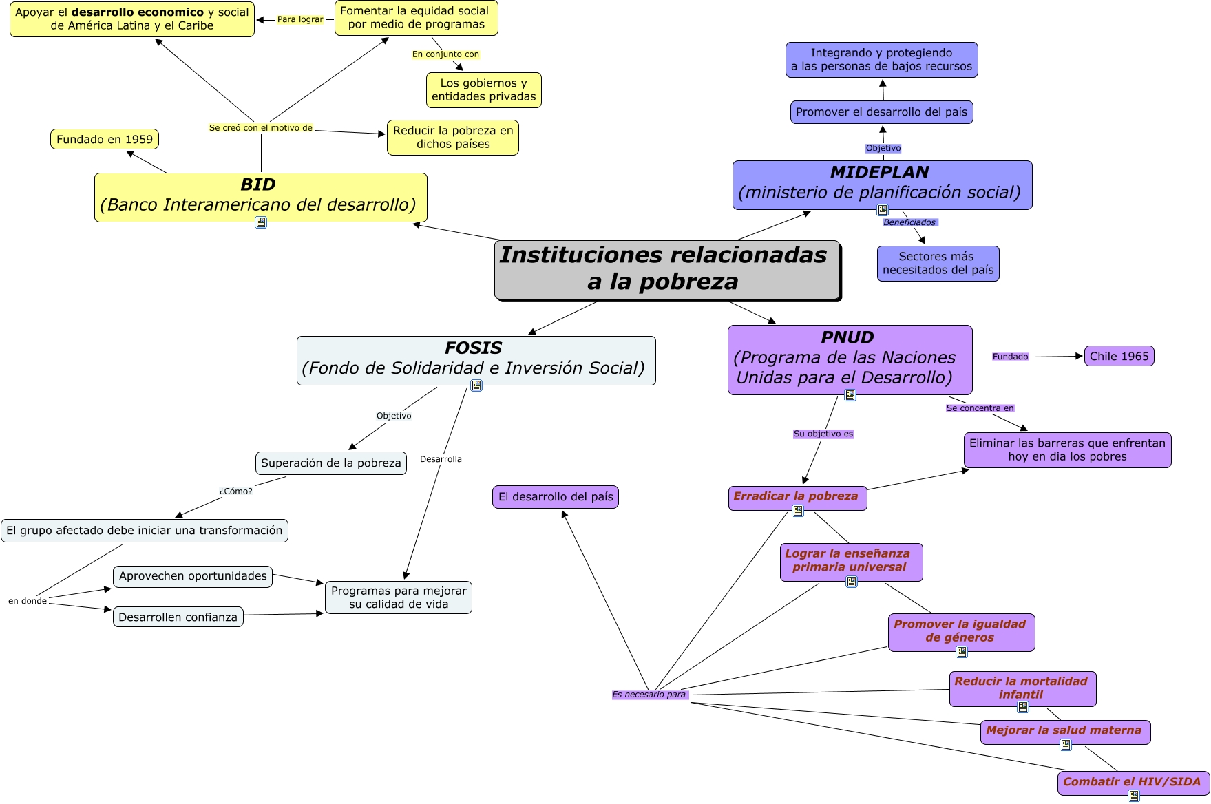 Este Cmap, tiene información relacionada con: Instituciones relacionadas(resumen), MIDEPLAN (ministerio de planificación social) Objetivo Promover el desarrollo del país, Reducir la mortalidad infantil Es necesario para El desarrollo del país, PNUD (Programa de las Naciones Unidas para el Desarrollo) Su objetivo es Erradicar la pobreza, BID (Banco Interamericano del desarrollo) Se creó con el motivo de Fomentar la equidad social por medio de programas, Fomentar la equidad social por medio de programas En conjunto con Los gobiernos y entidades privadas, Erradicar la pobreza Es necesario para El desarrollo del país, Lograr la enseñanza primaria universal ???? Promover la igualdad de géneros, Combatir el HIV/SIDA Es necesario para El desarrollo del país, Promover la igualdad de géneros Es necesario para El desarrollo del país, El grupo afectado debe iniciar una transformación en donde Aprovechen oportunidades, FOSIS (Fondo de Solidaridad e Inversión Social) Objetivo Superación de la pobreza, Mejorar la salud materna Es necesario para El desarrollo del país, BID (Banco Interamericano del desarrollo) Se creó con el motivo de Apoyar el desarrollo economico y social de América Latina y el Caribe, BID (Banco Interamericano del desarrollo) ???? Fundado en 1959, Erradicar la pobreza ???? Eliminar las barreras que enfrentan hoy en dia los pobres, BID (Banco Interamericano del desarrollo) Se creó con el motivo de Reducir la pobreza en dichos países, Lograr la enseñanza primaria universal Es necesario para El desarrollo del país, Mejorar la salud materna ???? Combatir el HIV/SIDA, Promover el desarrollo del país ???? Integrando y protegiendo a las personas de bajos recursos, FOSIS (Fondo de Solidaridad e Inversión Social) Desarrolla Programas para mejorar su calidad de vida