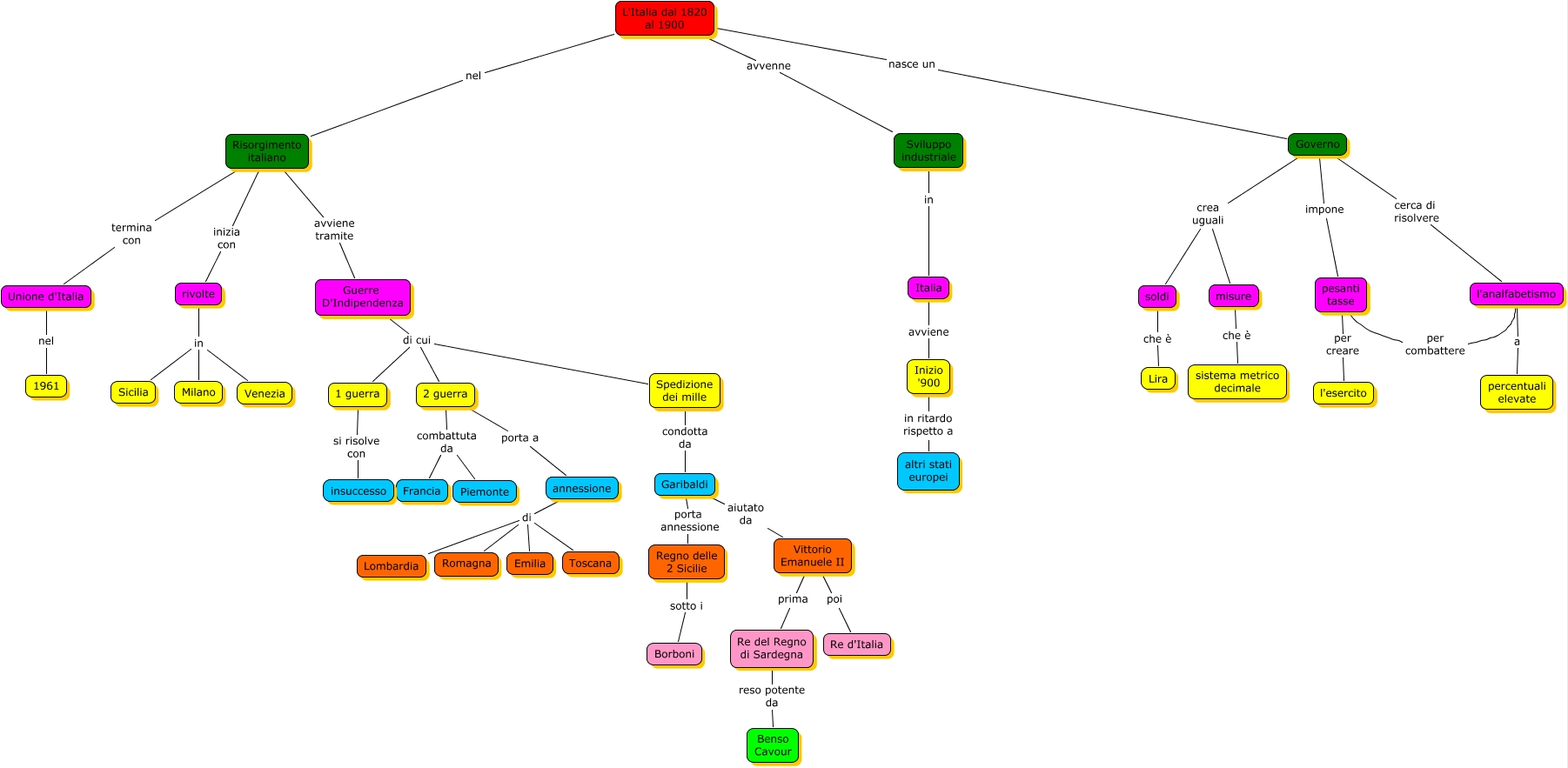 Questa Cmap, creata con IHMC CmapTools, contiene informazioni relative a: italia, L'Italia dal 1820 al 1900 nasce un Governo, Governo crea uguali misure, Inizio '900 in ritardo rispetto a altri stati europei, Italia avviene Inizio '900, rivolte in Venezia, annessione di Lombardia, 1 guerra si risolve con insuccesso, Re del Regno di Sardegna reso potente da Benso Cavour, 2 guerra combattuta da Francia, misure che è sistema metrico decimale, rivolte in Sicilia, pesanti tasse per combattere l'analfabetismo, Sviluppo industriale in Italia, annessione di Toscana, Vittorio Emanuele II poi Re d'Italia, Governo impone pesanti tasse, annessione di Emilia, Governo crea uguali soldi, pesanti tasse per creare l'esercito, Regno delle 2 Sicilie sotto i Borboni
