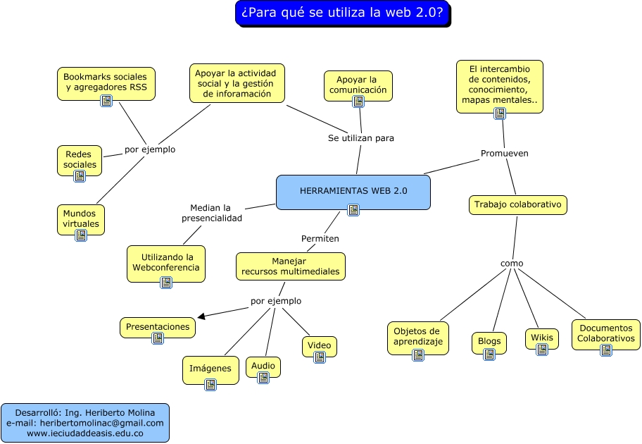 Este Cmap, tiene información relacionada con: web2.0, HERRAMIENTAS WEB 2.0 Se utilizan para Apoyar la comunicación, Manejar recursos multimediales por ejemplo Audio, HERRAMIENTAS WEB 2.0 Promueven Trabajo colaborativo, Trabajo colaborativo como Documentos Colaborativos, Manejar recursos multimediales por ejemplo Video, HERRAMIENTAS WEB 2.0 Permiten Manejar recursos multimediales, Apoyar la actividad social y la gestión de inforamación por ejemplo Redes sociales, Apoyar la actividad social y la gestión de inforamación por ejemplo Bookmarks sociales y agregadores RSS, Trabajo colaborativo como Wikis, Manejar recursos multimediales por ejemplo Presentaciones, Apoyar la actividad social y la gestión de inforamación por ejemplo Mundos virtuales, Trabajo colaborativo como Blogs, HERRAMIENTAS WEB 2.0 Promueven El intercambio de contenidos, conocimiento, mapas mentales.., Manejar recursos multimediales por ejemplo Imágenes, HERRAMIENTAS WEB 2.0 Median la presencialidad Utilizando la Webconferencia, Trabajo colaborativo como Objetos de aprendizaje, HERRAMIENTAS WEB 2.0 Se utilizan para Apoyar la actividad social y la gestión de inforamación