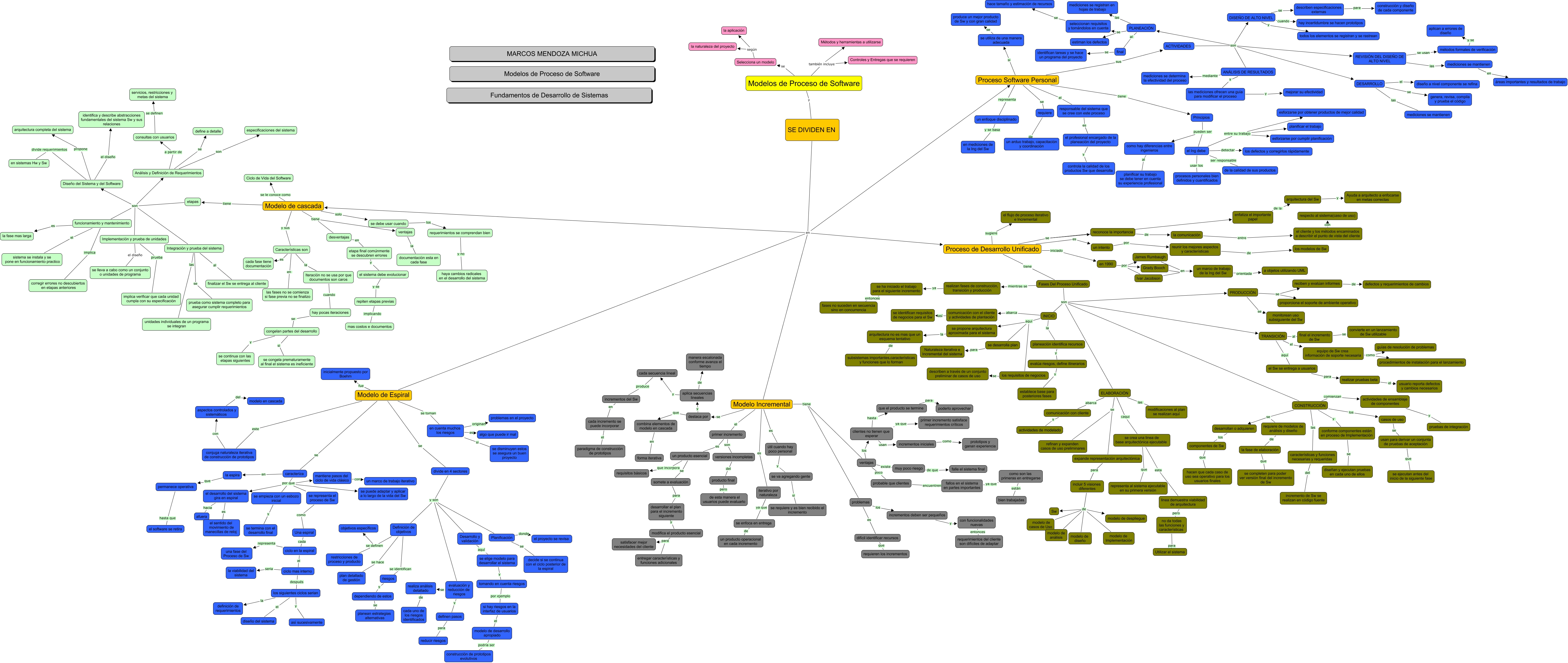 Este Cmap, tiene información relacionada con: modelos de proceso de sw, comunicación con cliente y actividades de modelado, linea demuestra viabilidad de arquitectura pero no da todas las funciones y características, Proceso Software Personal tiene Principios, realiza análisis detallado de cada uno de los riesgos identificados, Modelo Incremental tiene problemas, consultas con usuarios se definen servicios, restricciones y metas del sistema, Diseño del Sistema y del Software propone arquitectura completa del sistema, ELABORACIÓN las modificaciones al plan se realizan aquí, ciclo en la espiral representa una fase del Proceso de Sw, en 1990 por Ivar Jacobson, Ivar Jacobson en un marco de trabajo de la Ing del Sw, planeación identifica recursos y evalúa riesgos, define itinerarios, que el producto se termine para poderlo aprovechar, caracteriza por que se puede adaptar y aplicar a lo largo de la vida del Sw, en cuenta muchos los riesgos originan problemas en el proyecto, somete a evaluación para desarrollar el plan para el incremento siguiente, en 1990 por James Rumbaugh, en cuenta muchos los riesgos es algo que puede ir mal, Modelo de cascada tiene etapas, destaca por y aplica secuencias lineales