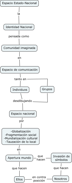Este Cmap, tiene información relacionada con: Estado nación, Apertura mundo que hacen Invasión de símbolos, Apertura mundo que hacen Ellos, Ellos en contra posición Nosotros, Comunidad imaginada en Espacio de comunicación, Identidad Nacional pensada como Comunidad imaginada, Grupos desdibujando Espacio nacional, Espacio nacional por -Globalización -Fragmentación social -Mundialización cultural -Tauzación de lo local, Espacio Estado-Nacional la Identidad Nacional, Espacio de comunicación tanto en Individuos, Individuos desdibujando Espacio nacional, Espacio de comunicación tanto en Grupos, Invasión de símbolos que hacen Nosotros, -Globalización -Fragmentación social -Mundialización cultural -Tauzación de lo local en Apertura mundo