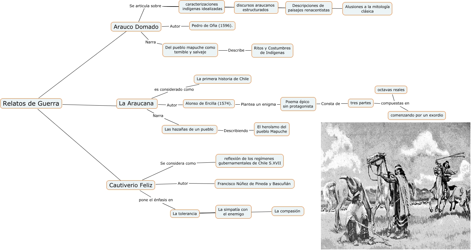 Este Cmap, tiene información relacionada con: araucanaaa, tres partes compuestas en comenzando por un exordio, La Araucana Autor Alonso de Ercilla (1574)., Cautiverio Feliz Autor Francisco Núñez de Pineda y Bascuñán, Poema épico sin protagonista Consta de tres partes, La Araucana Narra Las hazañas de un pueblo, La Araucana es considerado como La primera historia de Chile, Arauco Domado Se articula sobre discursos araucanos estructurados, Cautiverio Feliz pone el énfasis en La tolerancia, Arauco Domado Narra Del pueblo mapuche como temible y salvaje, Las hazañas de un pueblo Describiendo El heroísmo del pueblo Mapuche, Relatos de Guerra ???? La Araucana, Del pueblo mapuche como temible y salvaje Describe Ritos y Costumbres de Indígenas, Arauco Domado Se articula sobre Alusiones a la mitología clásica, Arauco Domado Se articula sobre Descripciones de paisajes renacentistas, Arauco Domado Autor Pedro de Oña (1596)., tres partes compuestas en octavas reales, La tolerancia ???? La simpatía con el enemigo, Arauco Domado Se articula sobre caracterizaciones indígenas idealizadas, Alonso de Ercilla (1574). Plantea un enigma Poema épico sin protagonista, Relatos de Guerra ???? Cautiverio Feliz