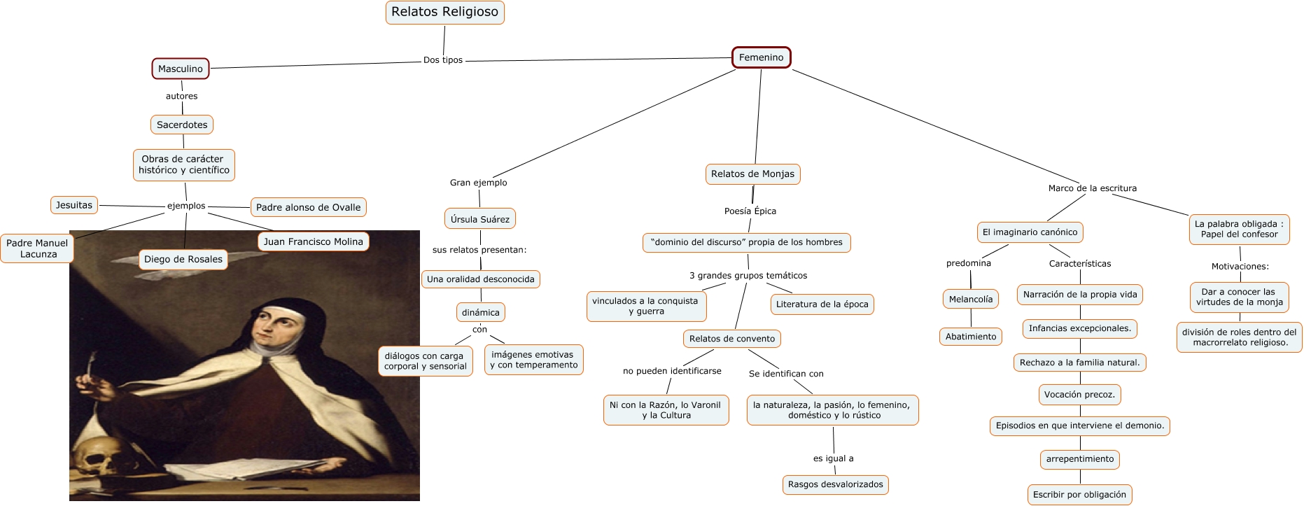 Este Cmap, tiene información relacionada con: Lireraturaaaaaaa, Femenino Poesía Épica Relatos de Monjas, El imaginario canónico Características arrepentimiento, “dominio del discurso” propia de los hombres 3 grandes grupos temáticos vinculados a la conquista y guerra, El imaginario canónico Características Rechazo a la familia natural., Obras de carácter histórico y científico ejemplos Diego de Rosales, El imaginario canónico Características Escribir por obligación, Femenino Marco de la escritura La palabra obligada : Papel del confesor, Relatos Religioso Dos tipos Femenino, Masculino autores Obras de carácter histórico y científico, dinámica con imágenes emotivas y con temperamento, El imaginario canónico predomina Abatimiento, Masculino autores Sacerdotes, El imaginario canónico predomina Melancolía, El imaginario canónico Características Vocación precoz., “dominio del discurso” propia de los hombres 3 grandes grupos temáticos Relatos de convento, Relatos de convento no pueden identificarse Ni con la Razón, lo Varonil y la Cultura, La palabra obligada : Papel del confesor Motivaciones: Dar a conocer las virtudes de la monja, la naturaleza, la pasión, lo femenino, doméstico y lo rústico es igual a Rasgos desvalorizados, Úrsula Suárez sus relatos presentan: Una oralidad desconocida, Femenino Poesía Épica “dominio del discurso” propia de los hombres
