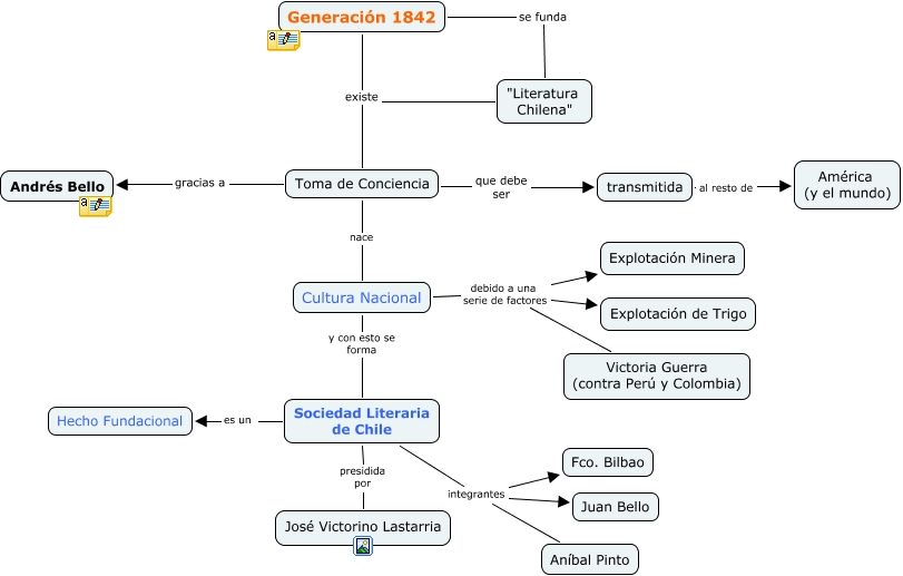 Este Cmap, tiene información relacionada con: Generación 1842, Sociedad Literaria de Chile es un Hecho Fundacional, Cultura Nacional debido a una serie de factores Victoria Guerra (contra Perú y Colombia), Sociedad Literaria de Chile presidida por José Victorino Lastarria, Toma de Conciencia gracias a Andrés Bello, Sociedad Literaria de Chile integrantes Juan Bello, Sociedad Literaria de Chile integrantes Aníbal Pinto, Cultura Nacional debido a una serie de factores Explotación de Trigo, Toma de Conciencia que debe ser transmitida, Toma de Conciencia nace Cultura Nacional, Cultura Nacional y con esto se forma Sociedad Literaria de Chile, Generación 1842 existe Toma de Conciencia, Sociedad Literaria de Chile integrantes Fco. Bilbao, transmitida al resto de América (y el mundo), Generación 1842 se funda "Literatura Chilena", Cultura Nacional debido a una serie de factores Explotación Minera, "Literatura Chilena" existe Toma de Conciencia