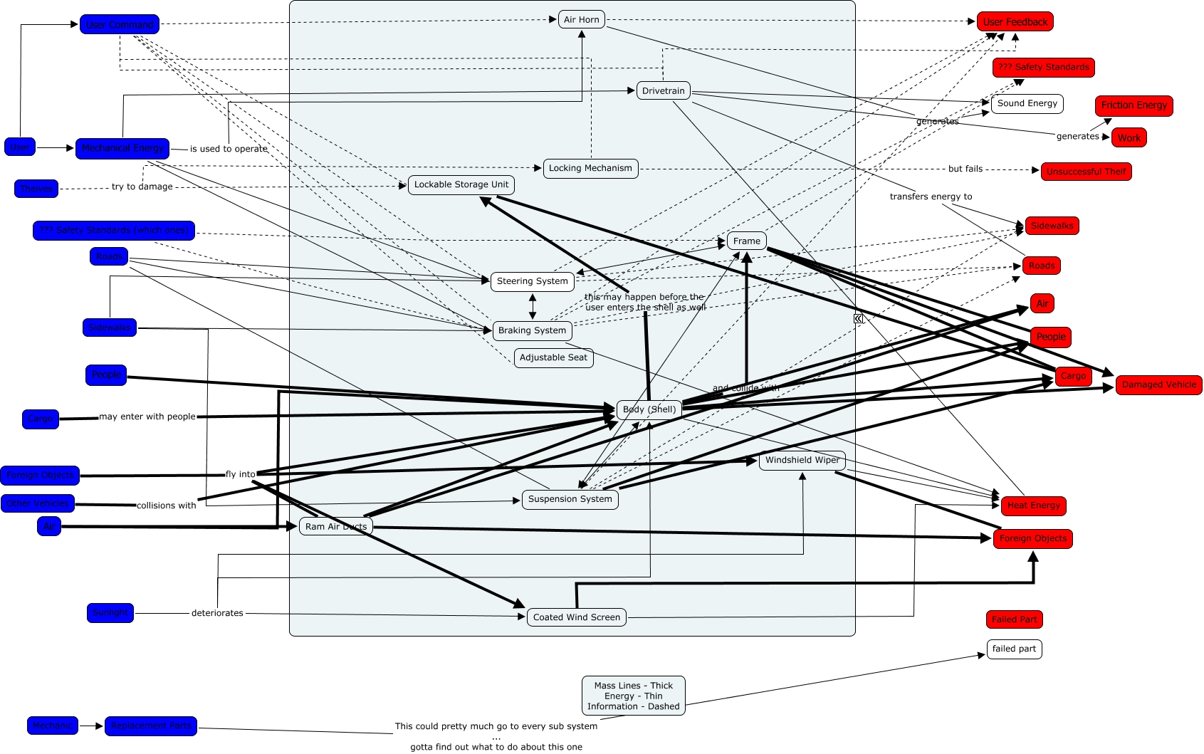 This Concept Map, created with IHMC CmapTools, has information related to: PAS, ??? Safety Standards (which ones) Braking System, Frame Cargo, Frame Damaged Vehicle, User User Command, Steering System Frame, Frame ??? Safety Standards, Frame People, Ram Air Ducts Body (Shell), Roads Braking System, Drivetrain generates Work, Theives try to damage Locking Mechanism, Theives try to damage Lockable Storage Unit, User Command Lockable Storage Unit, Suspension System Sidewalks, Foreign Objects fly into Body (Shell), Body (Shell) Damaged Vehicle, Drivetrain Heat Energy, User Command Locking Mechanism, Roads Suspension System, Air Body (Shell)
