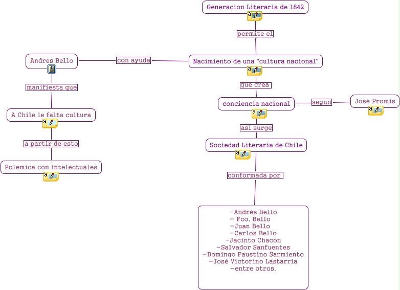 Este Cmap, tiene información relacionada con: generacion lit, Sociedad Literaria de Chile conformada por -Andrés Bello - Fco. Bello -Juan Bello -Carlos Bello -Jacinto Chacón -Salvador Sanfuentes -Domingo Faustino Sarmiento -José Victorino Lastarria -entre otros., conciencia nacional según José Promis, Nacimiento de una "cultura nacional" con ayuda Andres Bello, A Chile le falta cultura a partir de esto Polemica con intelectuales, conciencia nacional asi surge Sociedad Literaria de Chile, Andres Bello manifiesta que A Chile le falta cultura, Nacimiento de una "cultura nacional" que crea conciencia nacional, Nacimiento de una "cultura nacional" permite el Generacion Literaria de 1842