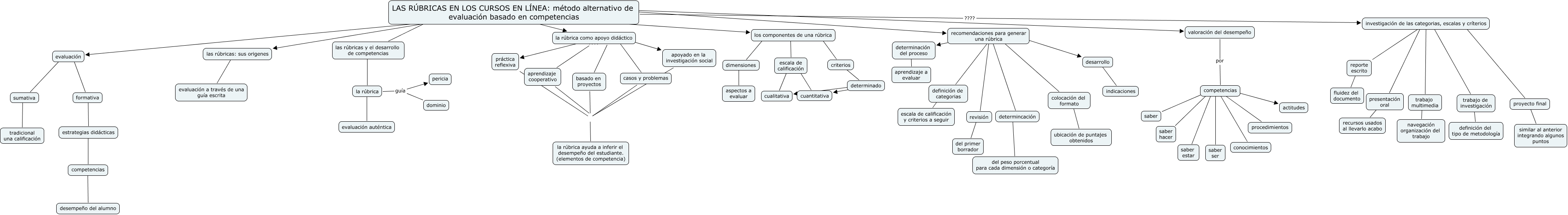 Este Cmap, tiene información relacionada con: rúbricas, recomendaciones para generar una rúbrica ???? desarrollo, proyecto final ???? similar al anterior integrando algunos puntos, competencias ???? saber hacer, la rúbrica guía pericia, la rúbrica como apoyo didáctico ???? basado en proyectos, criterios ???? determinado, determinado ???? cualitativa, trabajo multimedia ???? navegación organización del trabajo, competencias ???? saber ser, estrategias didácticas ???? competencias, colocación del formato ???? ubicación de puntajes obtenidos, escala de calificación ???? cualitativa, investigación de las categorias, escalas y críterios ???? trabajo de investigación, LAS RÚBRICAS EN LOS CURSOS EN LÍNEA: método alternativo de evaluación basado en competencias ???? recomendaciones para generar una rúbrica, presentación oral ???? recursos usados al llevarlo acabo, la rúbrica ???? evaluación auténtica, práctica reflexiva la rúbrica ayuda a inferir el desempeño del estudiante. (elementos de competencia), las rúbricas: sus origenes ???? evaluación a través de una guía escrita, revisión ???? del primer borrador, basado en proyectos la rúbrica ayuda a inferir el desempeño del estudiante. (elementos de competencia)