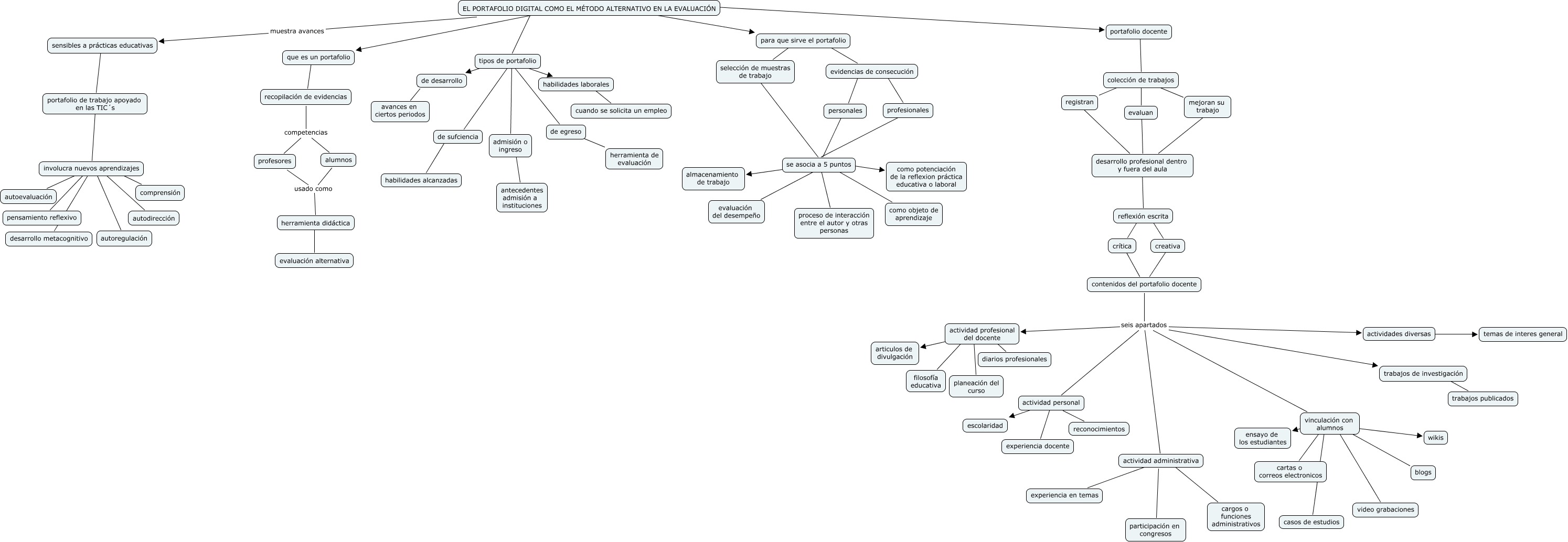 Este Cmap, tiene información relacionada con: portafolio digital, involucra nuevos aprendizajes ???? comprensión, actividad personal ???? reconocimientos, de desarrollo ???? avances en ciertos periodos, colección de trabajos ???? evaluan, contenidos del portafolio docente seis apartados actividad administrativa, actividad personal ???? escolaridad, EL PORTAFOLIO DIGITAL COMO EL MÉTODO ALTERNATIVO EN LA EVALUACIÓN ???? portafolio docente, personales ???? se asocia a 5 puntos, actividad profesional del docente ???? planeación del curso, recopilación de evidencias competencias profesores, creativa ???? contenidos del portafolio docente, contenidos del portafolio docente seis apartados actividad personal, se asocia a 5 puntos ???? evaluación del desempeño, trabajos de investigación ???? trabajos publicados, actividades diversas ???? temas de interes general, se asocia a 5 puntos ???? proceso de interacción entre el autor y otras personas, EL PORTAFOLIO DIGITAL COMO EL MÉTODO ALTERNATIVO EN LA EVALUACIÓN muestra avances sensibles a prácticas educativas, sensibles a prácticas educativas ???? portafolio de trabajo apoyado en las TIC´s, tipos de portafolio ???? admisión o ingreso, de egreso ???? herramienta de evaluación