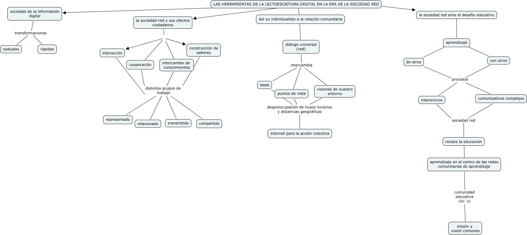 Este Cmap, tiene información relacionada con: lectoescritura, intercambio de conocimientos distintos grupos de trabajo relacionado, cooperación distintos grupos de trabajo relacionado, cooperación distintos grupos de trabajo transmitido, con otros procesos comunicativos complejos, LAS HERRAMIENTAS DE LA LECTOESCRITURA DIGITAL EN LA ERA DE LA SOCIEDAD RED ???? la sociedad-red y sus efectos ciudadanos, aprendizaje ???? de otros, construcción de saberes distintos grupos de trabajo compartido, de otros procesos interactivos, construcción de saberes distintos grupos de trabajo relacionado, renace la educación ???? aprendizaje en el centro de las redes comunitarias de aprendizaje, interacción distintos grupos de trabajo transmitido, LAS HERRAMIENTAS DE LA LECTOESCRITURA DIGITAL EN LA ERA DE LA SOCIEDAD RED ???? del yo individualista a la relación comunitaria, la sociedad-red y sus efectos ciudadanos intercambio de conocimientos, del yo individualista a la relación comunitaria ???? diálogo universal (red), cooperación distintos grupos de trabajo compartido, diálogo universal (red) intercambia puntos de vista, intercambio de conocimientos distintos grupos de trabajo representado, comunicativos complejos sociedad red renace la educación, construcción de saberes distintos grupos de trabajo representado, interacción distintos grupos de trabajo relacionado