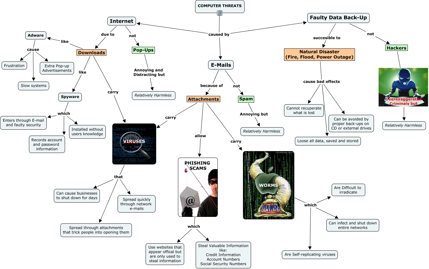 This Concept Map, created with IHMC CmapTools, has information related to: Pack, Christian Computer Threat Map, Attachments carry VIRUSES, WORMS which Are Self-replicating viruses, COMPUTER THREATS caused by E-Mails, PHISHING SCAMS which Steal Valuable Information like: Credit Information Account Numbers Social Security Numbers, Spyware which Records account and password information, Spyware which Enters through E-mail and faulty security, Attachments carry WORMS, Spyware which Installed without users knowledge, Pop-Ups Annoying and Distracting but Relatively Harmless, Internet due to Downloads, Downloads like Adware, Adware cause Frustration, Spam Annoying but Relatively Harmless, Faulty Data Back-Up not Hackers, VIRUSES that Spread through attachments that trick people into opening them, COMPUTER THREATS caused by Faulty Data Back-Up, Downloads carry VIRUSES, VIRUSES that Can cause businesses to shut down for days, WORMS which Are Difficult to irradicate, Adware cause Extra Pop-up Advertisements