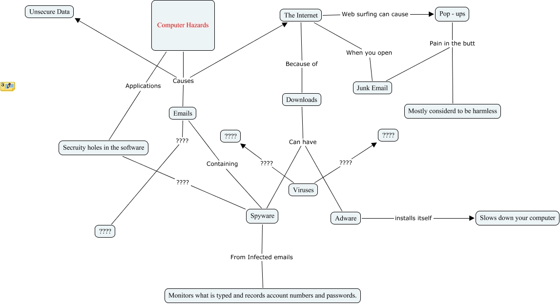 This Concept Map, created with IHMC CmapTools, has information related to: Taylor - Computer Threats, Emails ???? ????, Downloads Can have Adware, Computer Hazards Causes Emails, Pop - ups Pain in the butt Mostly considerd to be harmless, Computer Hazards Causes The Internet, Computer Hazards Causes Unsecure Data, Adware installs itself Slows down your computer, Secruity holes in the software ???? Spyware, Emails Containing Spyware, Viruses ???? ????, Spyware From Infected emails Monitors what is typed and records account numbers and passwords., Viruses ???? ????, The Internet Web surfing can cause Pop - ups, Junk Email Pain in the butt Mostly considerd to be harmless, Computer Hazards Applications Secruity holes in the software, The Internet When you open Junk Email, Downloads Can have Spyware, The Internet Because of Downloads