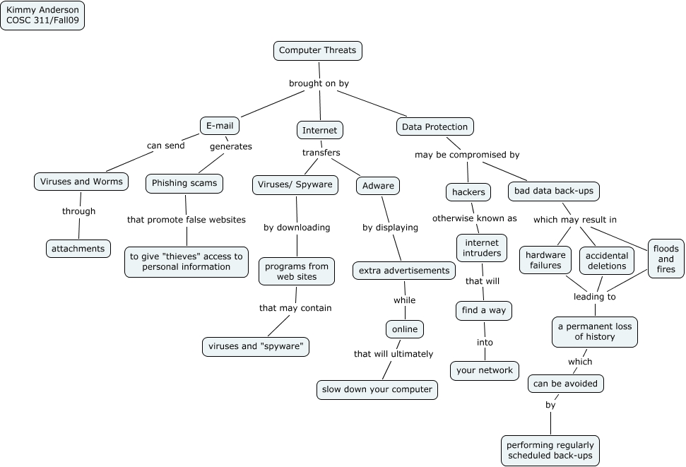 This Concept Map, created with IHMC CmapTools, has information related to: Computer Threats, Viruses and Worms through attachments, E-mail generates Phishing scams, Internet transfers Viruses/ Spyware, accidental deletions leading to a permanent loss of history, Adware by displaying extra advertisements, accidental deletions leading to a permanent loss of history, can be avoided by performing regularly scheduled back-ups, a permanent loss of history which can be avoided, Viruses/ Spyware by downloading programs from web sites, Computer Threats brought on by Data Protection, floods and fires leading to a permanent loss of history, Internet transfers Adware, online that will ultimately slow down your computer, E-mail can send Viruses and Worms, Data Protection may be compromised by bad data back-ups, find a way into your network, Computer Threats brought on by E-mail, Computer Threats brought on by Internet, bad data back-ups which may result in accidental deletions, hackers otherwise known as internet intruders