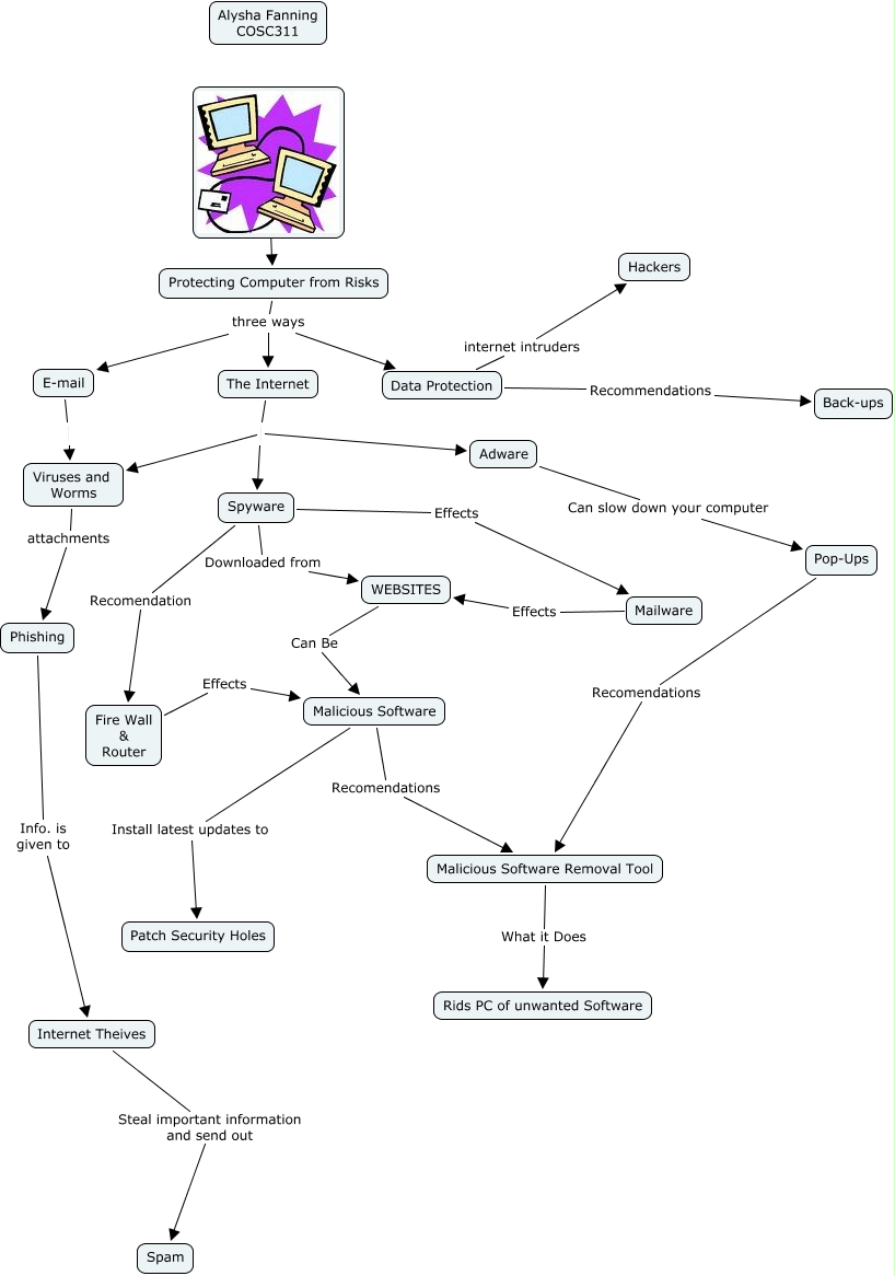 This Concept Map, created with IHMC CmapTools, has information related to: Fanning, Alysha, WEBSITES Can Be Malicious Software, E-mail Viruses and Worms, Spyware Recomendation Fire Wall & Router, The Internet Adware, Phishing Info. is given to Internet Theives, ???? Protecting Computer from Risks, The Internet Viruses and Worms, Internet Theives Steal important information and send out Spam, Fire Wall & Router Effects Malicious Software, Malicious Software Removal Tool What it Does Rids PC of unwanted Software, Viruses and Worms attachments Phishing, Data Protection Recommendations Back-ups, Pop-Ups Recomendations Malicious Software Removal Tool, Spyware Effects Mailware, The Internet Spyware, Protecting Computer from Risks three ways The Internet, Spyware Downloaded from WEBSITES, Protecting Computer from Risks three ways E-mail, Malicious Software Recomendations Malicious Software Removal Tool, Mailware Effects WEBSITES