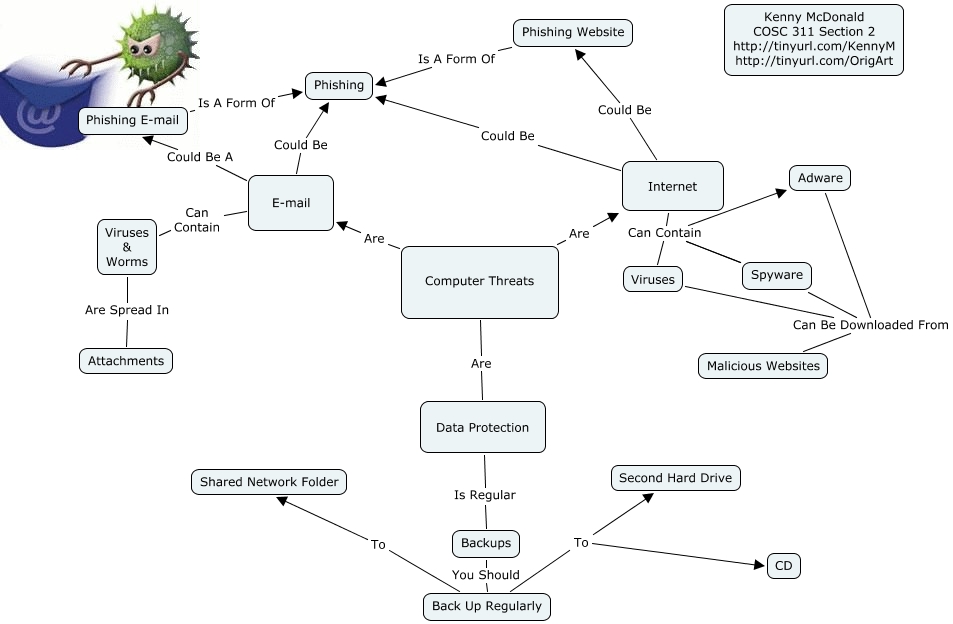 This Concept Map, created with IHMC CmapTools, has information related to: McDonald, Kenny, Viruses Can Be Downloaded From Malicious Websites, Computer Threats Are Internet, Back Up Regularly To Shared Network Folder, Computer Threats Are E-mail, Back Up Regularly To CD, Internet Could Be Phishing, Internet Could Be Phishing Website, Internet Can Contain Viruses, Spyware Can Be Downloaded From Malicious Websites, Internet Can Contain Spyware, Computer Threats Are Data Protection, Adware Can Be Downloaded From Malicious Websites, Phishing E-mail Is A Form Of Phishing, E-mail Could Be A Phishing E-mail, E-mail Could Be Phishing, Data Protection Is Regular Backups, Backups You Should Back Up Regularly, Internet Can Contain Adware, Viruses & Worms Are Spread In Attachments, Internet Can Contain Spyware