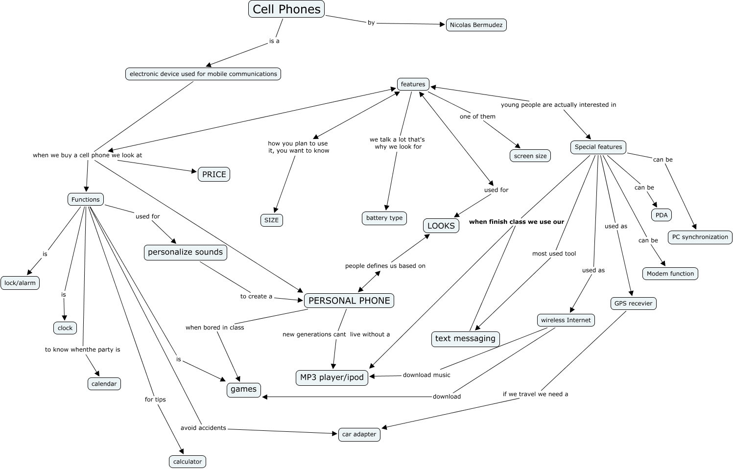 This Concept Map, created with IHMC CmapTools, has information related to: Nicolas bermudez cell phones, Cell Phones by Nicolas Bermudez, features how you plan to use it, you want to know SIZE, Functions used for personalize sounds, Functions avoid accidents car adapter, Functions is games, personalize sounds to create a PERSONAL PHONE, Functions is lock/alarm, Special features used as GPS recevier, PERSONAL PHONE people defines us based on LOOKS, features one of them screen size, Special features when finish class we use our MP3 player/ipod, Special features can be PC synchronization, PERSONAL PHONE when bored in class games, wireless Internet download games, Special features most used tool text messaging, electronic device used for mobile communications when we buy a cell phone we look at PRICE, text messaging when finish class we use our MP3 player/ipod, features used for LOOKS, electronic device used for mobile communications when we buy a cell phone we look at PERSONAL PHONE, electronic device used for mobile communications when we buy a cell phone we look at features