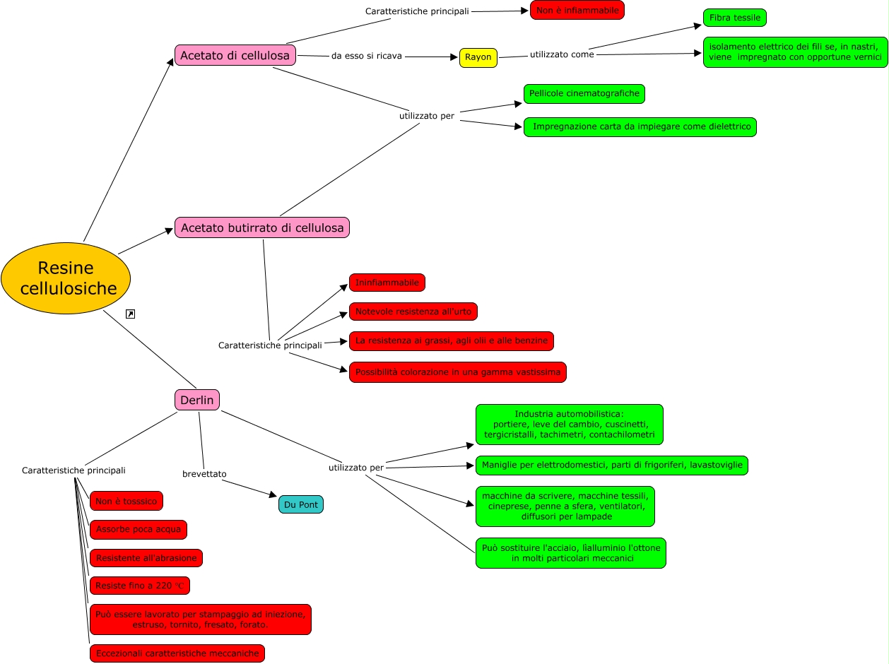 Questa Cmap, creata con IHMC CmapTools, contiene informazioni relative a: Resine cellulosiche, Resine cellulosiche Acetato di cellulosa, Derlin utilizzato per Può sostituire l'acciaio, lìalluminio l'ottone in molti particolari meccanici, Rayon utilizzato come Fibra tessile, Derlin utilizzato per Industria automobilistica: portiere, leve del cambio, cuscinetti, tergicristalli, tachimetri, contachilometri, Derlin brevettato Du Pont, Acetato di cellulosa utilizzato per Pellicole cinematografiche, Acetato butirrato di cellulosa Caratteristiche principali Ininfiammabile, Acetato di cellulosa utilizzato per Impregnazione carta da impiegare come dielettrico, Derlin Caratteristiche principali Non è tosssico, Acetato butirrato di cellulosa utilizzato per Pellicole cinematografiche, Acetato di cellulosa Caratteristiche principali Non è infiammabile, Rayon utilizzato come isolamento elettrico dei fili se, in nastri, viene impregnato con opportune vernici, Acetato butirrato di cellulosa utilizzato per Impregnazione carta da impiegare come dielettrico, Derlin Caratteristiche principali Resistente all'abrasione, Derlin Caratteristiche principali Resiste fino a 220 °C, Acetato butirrato di cellulosa Caratteristiche principali Possibilità colorazione in una gamma vastissima, Derlin utilizzato per Maniglie per elettrodomestici, parti di frigoriferi, lavastoviglie, Acetato butirrato di cellulosa Caratteristiche principali Notevole resistenza all'urto, Resine cellulosiche Acetato butirrato di cellulosa, Acetato di cellulosa da esso si ricava Rayon