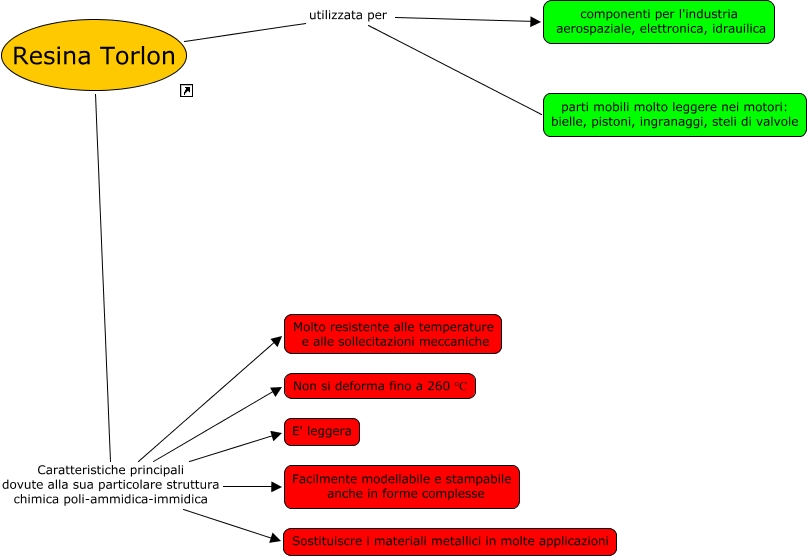 Questa Cmap, creata con IHMC CmapTools, contiene informazioni relative a: Resina Torlon, Resina Torlon Caratteristiche principali dovute alla sua particolare struttura chimica poli-ammidica-immidica Molto resistente alle temperature e alle sollecitazioni meccaniche, Resina Torlon Caratteristiche principali dovute alla sua particolare struttura chimica poli-ammidica-immidica Sostituiscre i materiali metallici in molte applicazioni, Resina Torlon Caratteristiche principali dovute alla sua particolare struttura chimica poli-ammidica-immidica E' leggera, Resina Torlon utilizzata per componenti per l'industria aerospaziale, elettronica, idrauilica, Resina Torlon Caratteristiche principali dovute alla sua particolare struttura chimica poli-ammidica-immidica Non si deforma fino a 260 °C, Resina Torlon Caratteristiche principali dovute alla sua particolare struttura chimica poli-ammidica-immidica Facilmente modellabile e stampabile anche in forme complesse, Resina Torlon utilizzata per parti mobili molto leggere nei motori: bielle, pistoni, ingranaggi, steli di valvole