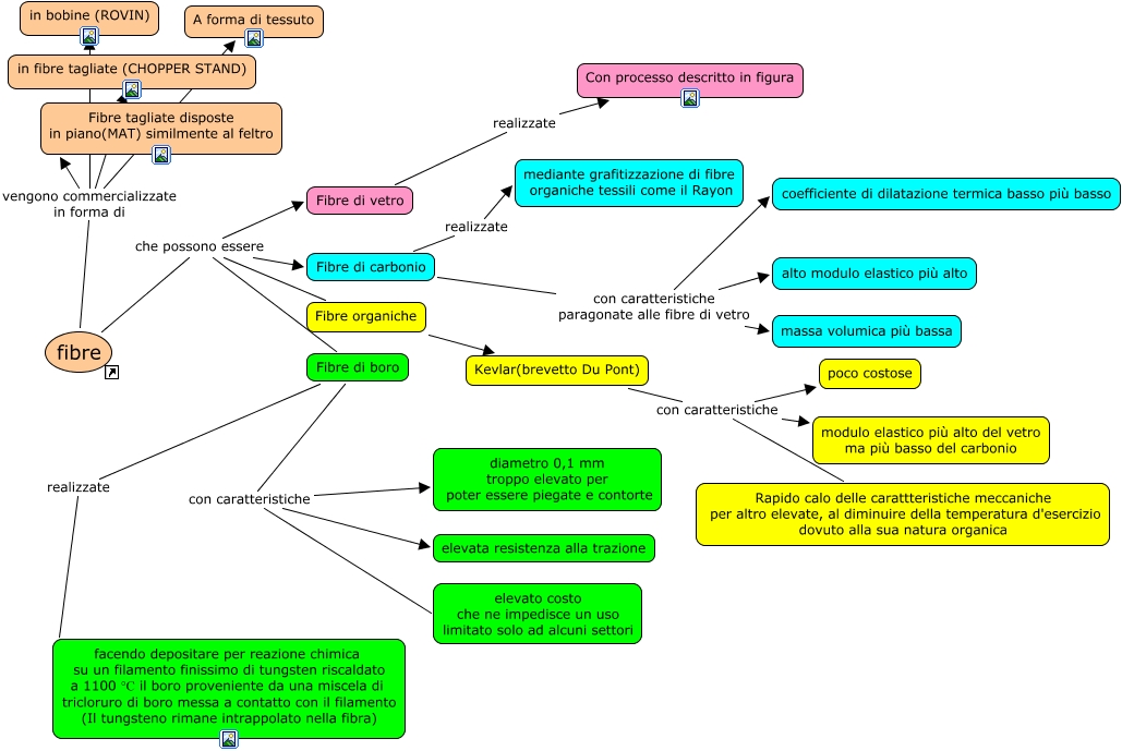 Questa Cmap, creata con IHMC CmapTools, contiene informazioni relative a: Fibre, fibre che possono essere Fibre organiche, Fibre di carbonio con caratteristiche paragonate alle fibre di vetro coefficiente di dilatazione termica basso più basso, Fibre organiche Kevlar(brevetto Du Pont), Fibre di carbonio realizzate mediante grafitizzazione di fibre organiche tessili come il Rayon, Kevlar(brevetto Du Pont) con caratteristiche Rapido calo delle carattteristiche meccaniche per altro elevate, al diminuire della temperatura d'esercizio dovuto alla sua natura organica, Fibre di boro con caratteristiche elevato costo che ne impedisce un uso limitato solo ad alcuni settori, fibre che possono essere Fibre di boro, Kevlar(brevetto Du Pont) con caratteristiche modulo elastico più alto del vetro ma più basso del carbonio, fibre che possono essere Fibre di vetro, Fibre di boro realizzate facendo depositare per reazione chimica su un filamento finissimo di tungsten riscaldato a 1100 °C il boro proveniente da una miscela di tricloruro di boro messa a contatto con il filamento (Il tungsteno rimane intrappolato nella fibra), fibre vengono commercializzate in forma di in fibre tagliate (CHOPPER STAND), Fibre di boro con caratteristiche elevata resistenza alla trazione, fibre vengono commercializzate in forma di Fibre tagliate disposte in piano(MAT) similmente al feltro, Fibre di carbonio con caratteristiche paragonate alle fibre di vetro alto modulo elastico più alto, Fibre di boro con caratteristiche diametro 0,1 mm troppo elevato per poter essere piegate e contorte, Fibre di vetro realizzate Con processo descritto in figura, fibre vengono commercializzate in forma di in bobine (ROVIN), fibre vengono commercializzate in forma di A forma di tessuto, Fibre di carbonio con caratteristiche paragonate alle fibre di vetro massa volumica più bassa, Kevlar(brevetto Du Pont) con caratteristiche poco costose
