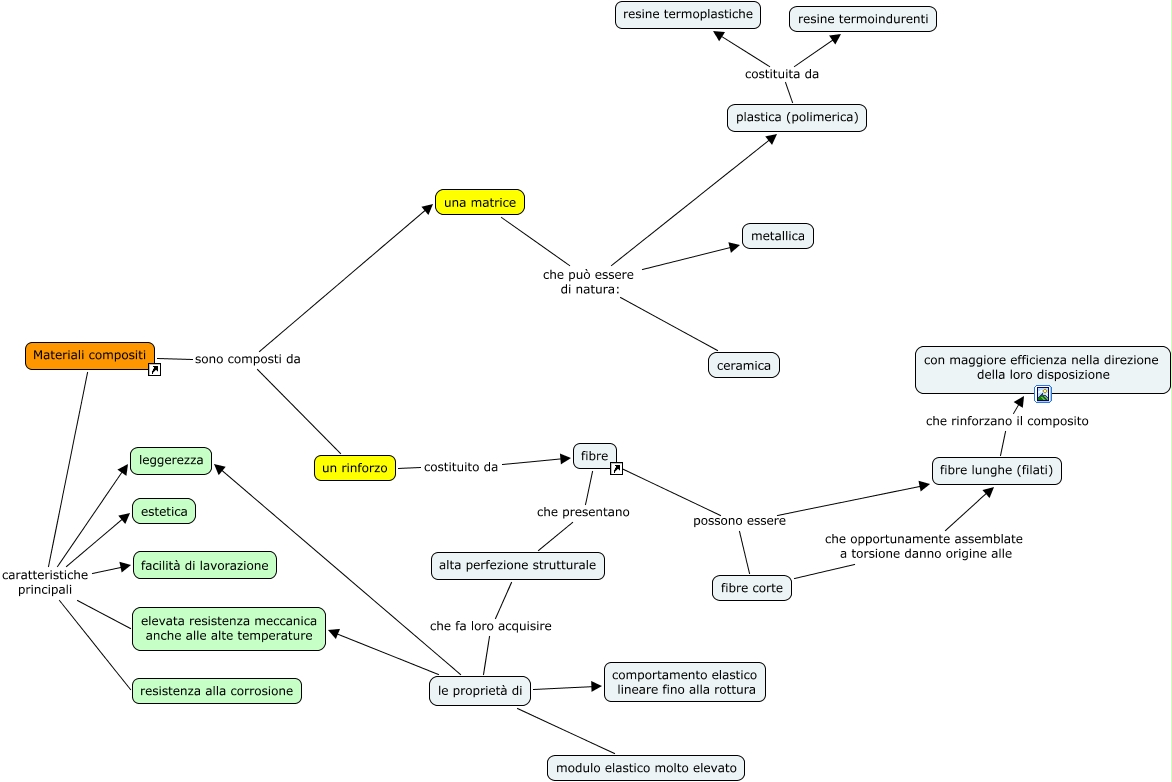 Questa Cmap, creata con IHMC CmapTools, contiene informazioni relative a: Materiali compositi, fibre corte che opportunamente assemblate a torsione danno origine alle fibre lunghe (filati), Materiali compositi caratteristiche principali resistenza alla corrosione, plastica (polimerica) costituita da resine termoplastiche, fibre che presentano alta perfezione strutturale, una matrice che può essere di natura: metallica, fibre lunghe (filati) che rinforzano il composito con maggiore efficienza nella direzione della loro disposizione, le proprietà di leggerezza, una matrice che può essere di natura: ceramica, una matrice che può essere di natura: plastica (polimerica), le proprietà di modulo elastico molto elevato, Materiali compositi caratteristiche principali estetica, le proprietà di elevata resistenza meccanica anche alle alte temperature, Materiali compositi sono composti da una matrice, plastica (polimerica) costituita da resine termoindurenti, Materiali compositi caratteristiche principali facilità di lavorazione, Materiali compositi caratteristiche principali leggerezza, le proprietà di comportamento elastico lineare fino alla rottura, Materiali compositi caratteristiche principali elevata resistenza meccanica anche alle alte temperature, fibre possono essere fibre lunghe (filati), fibre possono essere fibre corte