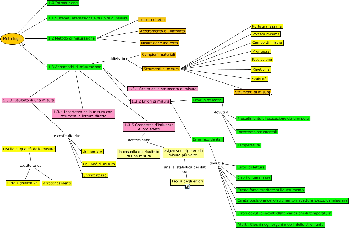 Questa Cmap, creata con IHMC CmapTools, contiene informazioni relative a: Metrologia, 1.3.3 Risultato di una misura Livello di qualità delle misure, Errori accidentali dovuti a Errori di lettura, Errori sistematici dovuti a Temperatura, Errori accidentali dovuti a Errori dovuti a incontrollate variazioni di temperatura, Errori sistematici dovuti a Incertezze strumentali, Strumenti di misura Portata massima, 1.3 Apparecchi di misurazione 1.3.4 Incertezza nella misura con strumenti a lettura diretta, 1.3 Apparecchi di misurazione suddivisi in Campioni materiali, 1.3.5 Grandezze d'influenza e loro effetti determinano la casualià del risultato di una misura, Livello di qualità delle misure costituito da Arrotondamenti, Metrologia 1.0 Introduzione, 1.2 Metodo di misurazione Misurazione indiretta, Strumenti di misura Portata minima, Errori accidentali dovuti a Errate forze eseritate sullo strumento, Errori sistematici dovuti a Procedimento di esecuzione della misura, Strumenti di misura Prontezza, 1.3.5 Grandezze d'influenza e loro effetti determinano esigenza di ripetere la misura più volte, 1.3.2 Errori di misura Errori accidentali, Strumenti di misura Stabilità, 1.2 Metodo di misurazione Lettura diretta