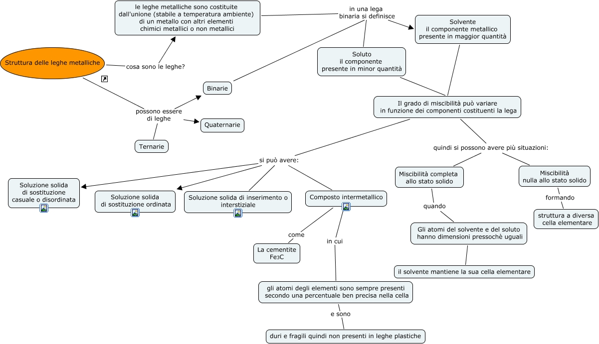 Questa Cmap, creata con IHMC CmapTools, contiene informazioni relative a: Struttura delle leghe metalliche, Il grado di miscibilità può variare in funzione dei componenti costituenti la lega quindi si possono avere più situazioni: Miscibilità nulla allo stato solido, Struttura delle leghe metalliche cosa sono le leghe? le leghe metalliche sono costituite dall'unione (stabile a temperatura ambiente) di un metallo con altri elementi chimici metallici o non metallici, Struttura delle leghe metalliche possono essere di leghe Binarie, Composto intermetallico in cui gli atomi degli elementi sono sempre presenti secondo una percentuale ben precisa nella cella, Soluto il componente presente in minor quantità Il grado di miscibilità può variare in funzione dei componenti costituenti la lega, Composto intermetallico come La cementite Fe3C, Miscibilità nulla allo stato solido formando struttura a diversa cella elementare, Struttura delle leghe metalliche possono essere di leghe Quaternarie, Solvente il componente metallico presente in maggior quantità Il grado di miscibilità può variare in funzione dei componenti costituenti la lega, Il grado di miscibilità può variare in funzione dei componenti costituenti la lega si può avere: Composto intermetallico, Il grado di miscibilità può variare in funzione dei componenti costituenti la lega si può avere: Soluzione solida di sostituzione ordinata, Miscibilità completa allo stato solido quando Gli atomi del solvente e del soluto hanno dimensioni pressochè uguali, Gli atomi del solvente e del soluto hanno dimensioni pressochè uguali il solvente mantiene la sua cella elementare, le leghe metalliche sono costituite dall'unione (stabile a temperatura ambiente) di un metallo con altri elementi chimici metallici o non metallici in una lega binaria si definisce Soluto il componente presente in minor quantità, le leghe metalliche sono costituite dall'unione (stabile a temperatura ambiente) di un metallo con altri elementi chimici metallici o non metallici in una lega binaria si definisce Solvente il componente metallico presente in maggior quantità, Struttura delle leghe metalliche possono essere di leghe Ternarie, Il grado di miscibilità può variare in funzione dei componenti costituenti la lega si può avere: Soluzione solida di sostituzione casuale o disordinata, gli atomi degli elementi sono sempre presenti secondo una percentuale ben precisa nella cella e sono duri e fragili quindi non presenti in leghe plastiche, Il grado di miscibilità può variare in funzione dei componenti costituenti la lega si può avere: Soluzione solida di inserimento o interstiziale, Binarie in una lega binaria si definisce Soluto il componente presente in minor quantità