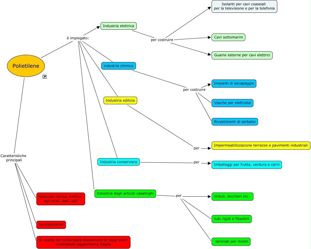 Questa Cmap, creata con IHMC CmapTools, contiene informazioni relative a: Polietilene, industria chimica per costruire Rivestimenti di serbatoi, Polietilene Caratteristiche principali Si ossida per prolungata esposizione ai raggi solari diventando leggermente fragile, Industria conserviera per Imballaggi per frutta, verdura e carni, Polietilene è impiegato: industria chimica, Polietilene Caratteristiche principali Idrorepellente, Industria elettrica per costruire Guaine esterne per cavi elettrici, Polietilene è impiegato: Industria edilizia, Industria elettrica per costruire Cavi sottomarini, Polietilene Caratteristiche principali Notevole inerzia chimica agli acidi, basi, sali, industria chimica per costruire Impianti di decapaggio, Polietilene è impiegato: Industria elettrica, Industria degli articoli casalinghi per tubi rigidi e flessibili, Polietilene è impiegato: Industria conserviera, Industria degli articoli casalinghi per imbuti, bicchieri etc.., industria chimica per costruire Vasche per elettrolisi, Polietilene è impiegato: Industria degli articoli casalinghi, Industria elettrica per costruire Isolanti per cavi coassiali per la televisione e per la telefonia, Industria edilizia per Impermeabilizzazione terrazze e pavimenti industriali, Industria degli articoli casalinghi per laminati per mobili