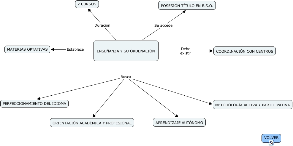 Este Cmap, tiene información relacionada con: ENSEÑANZA (LEA 17-2007), ENSEÑANZA Y SU ORDENACIÓN Debe existir COORDINACIÓN CON CENTROS, ENSEÑANZA Y SU ORDENACIÓN Busca ORIENTACIÓN ACADÉMICA Y PROFESIONAL, ENSEÑANZA Y SU ORDENACIÓN Se accede POSESIÓN TÍTULO EN E.S.O., ENSEÑANZA Y SU ORDENACIÓN Busca METODOLOGÍA ACTIVA Y PARTICIPATIVA, ENSEÑANZA Y SU ORDENACIÓN Duración 2 CURSOS, ENSEÑANZA Y SU ORDENACIÓN Busca PERFECCIONAMIENTO DEL IDIOMA, ENSEÑANZA Y SU ORDENACIÓN Establece MATERIAS OPTATIVAS, ENSEÑANZA Y SU ORDENACIÓN Busca APRENDIZAJE AUTÓNOMO