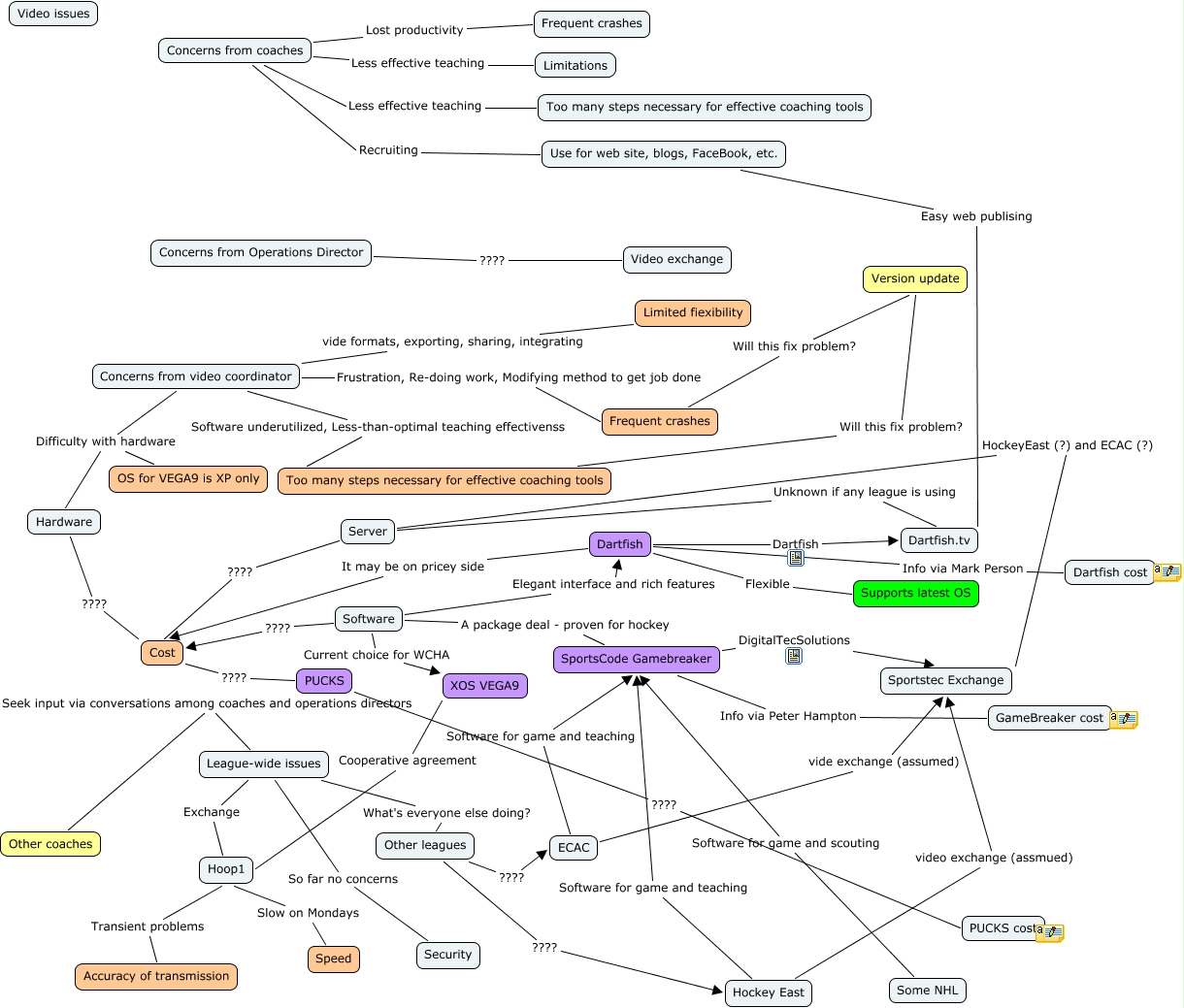This Concept Map, created with IHMC CmapTools, has information related to: Hockey Video Issues 2009, League-wide issues Exchange Hoop1, Hoop1 Slow on Mondays Speed, Software Current choice for WCHA XOS VEGA9, Concerns from video coordinator Difficulty with hardware Hardware, Other leagues ???? Hockey East, Use for web site, blogs, FaceBook, etc. Easy web publising Dartfish.tv, Concerns from coaches Less effective teaching Limitations, League-wide issues What's everyone else doing? Other leagues, Hoop1 Cooperative agreement XOS VEGA9, Dartfish Flexible Supports latest OS, Concerns from video coordinator Software underutilized, Less-than-optimal teaching effectivenss Too many steps necessary for effective coaching tools, Other leagues ???? ECAC, Hockey East video exchange (assmued) Sportstec Exchange, League-wide issues So far no concerns Security, SportsCode Gamebreaker Info via Peter Hampton GameBreaker cost, Software Elegant interface and rich features Dartfish, Concerns from video coordinator vide formats, exporting, sharing, integrating Limited fiexibility, Concerns from coaches Recruiting Use for web site, blogs, FaceBook, etc., Dartfish Info via Mark Person Dartfish cost, Concerns from video coordinator Difficulty with hardware OS for VEGA9 is XP only