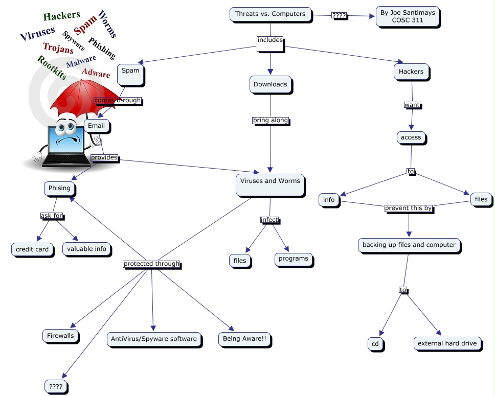 This Concept Map, created with IHMC CmapTools, has information related to: Joe Santimays, backing up files and computer to external hard drive, backing up files and computer to cd, Viruses and Worms protected through Phising, Viruses and Worms protected through Being Aware!!, Phising ask for valuable info, Email provides Viruses and Worms, info prevent this by backing up files and computer, Threats vs. Computers ???? By Joe Santimays COSC 311, Email provides Phising, files prevent this by backing up files and computer, Hackers want access, Viruses and Worms infect programs, Threats vs. Computers includes Spam, Phising ask for credit card, Threats vs. Computers includes Hackers, Threats vs. Computers includes Downloads, access to files, Viruses and Worms protected through ????, access to info, Spam comes through Email