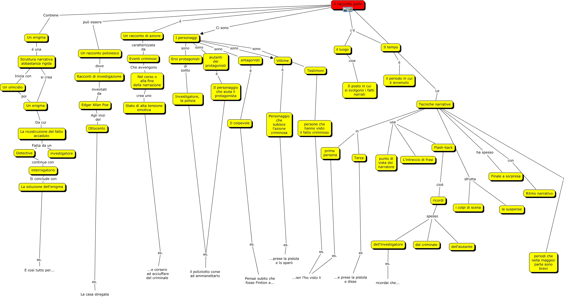 Questa Cmap, creata con IHMC CmapTools, contiene informazioni relative a: Il racconto giallo, Tecniche narrative usa punto di vista del narratore, Il tempo è il periodo in cui è avvenuto, Un enigma é una Struttura narrativa abbastanza rigida, aiutanti dei protagonisti è Il personaggio che aiuta il protagonista, Il racconto giallo é Un racconto di azione, il luogo cioe Il posto in cui si svolgono i fatti narrati, Tecniche narrative con Ritmo narrativo, Detective continua con interrogatorio, Il colpevole es. Pensai subito che fosse Fintion a..., La ricostruzione del fatto accaduto Fatta da un Detective, I personaggi sono Vittime, Vittime è Personaggio che subisce l'azione criminosa, ricordi spesso dell'aiutante, Il personaggio che aiuta il protagonista es. il poliziiotto corse ad ammanettarlo, Racconti di investigazione inventati da Edgar Allan Poe, Ottocento es. La casa stregata, Tecniche narrative sfrutta la suspense, Testimoni sono persone che hanno visto il fatto criminoso, Eroi protagonisti di solito Investigatore, la polizia, antagonisti è Il colpevole