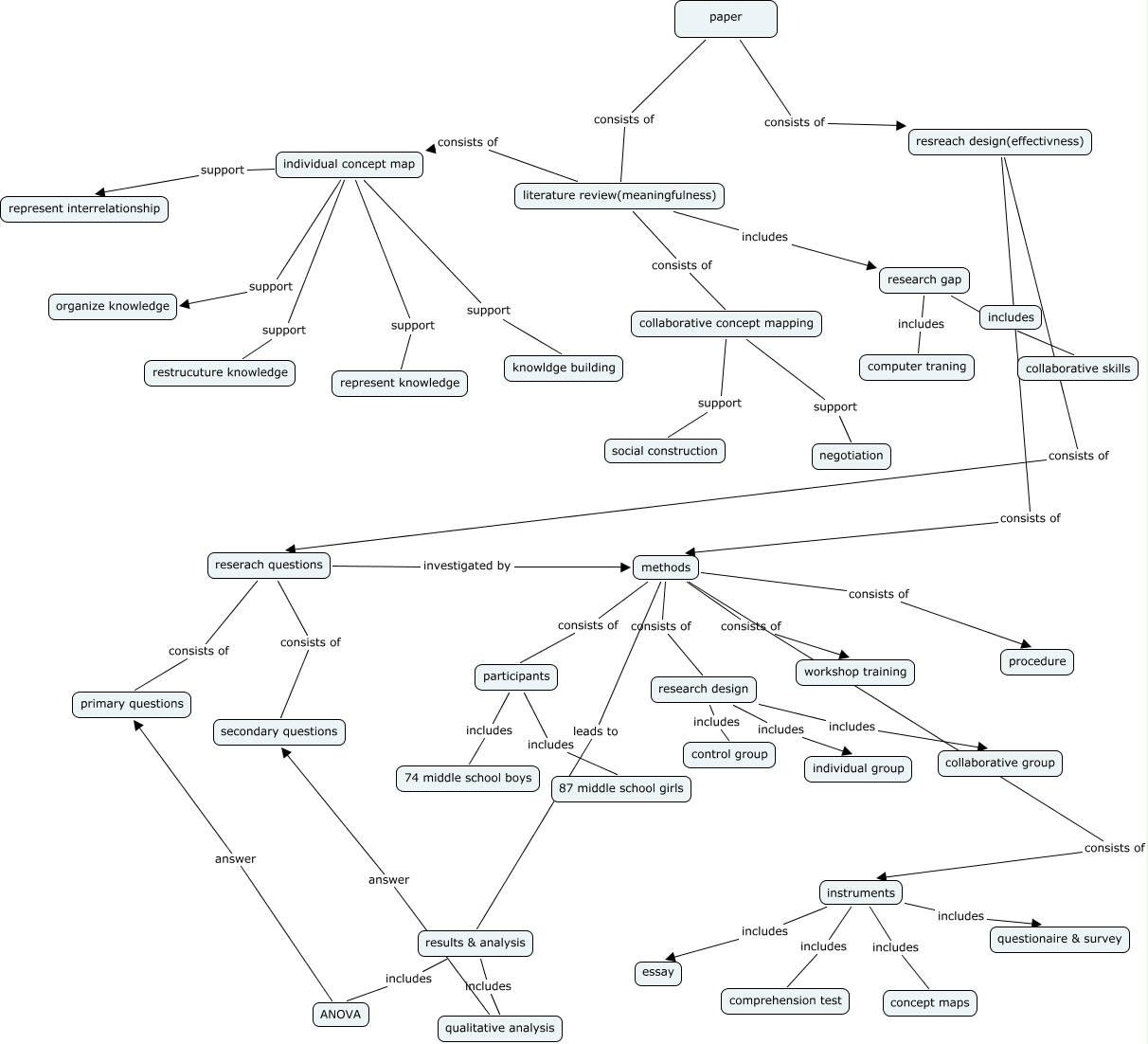 This Concept Map, created with IHMC CmapTools, has information related to: group2_cm, individual concept map support restrucuture knowledge, methods leads to results & analysis, methods consists of procedure, methods consists of participants, literature review(meaningfulness) consists of collaborative concept mapping, research gap includes computer traning, individual concept map support represent knowledge, reserach questions investigated by methods, research design includes control group, methods consists of workshop training, paper consists of literature review(meaningfulness), research gap ???? collaborative skills, individual concept map support organize knowledge, instruments includes concept maps, individual concept map support knowldge building, collaborative concept mapping support social construction, instruments includes questionaire & survey, instruments includes essay, results & analysis includes ANOVA, instruments includes comprehension test