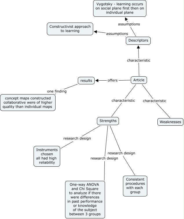 This Concept Map, created with IHMC CmapTools, has information related to: Kwon and Cifuentes Article Map, Article offers results, Descriptors assumptions Constructivist approach to learning, Article characteristic Weaknesses, Strengths research design Consistent procedures with each group, results one finding concept maps constructed collaborative were of higher quality than individual maps, Article characteristic Descriptors, Article characteristic Strengths, Strengths research design One-way ANOVA and Chi Square to analyze if there were differences in past performance or knowledge of the subject between 3 groups, Descriptors assumptions Vygotsky - learning occurs on social plane first then on individual plane, Strengths research design Instruments chosen all had high reliability