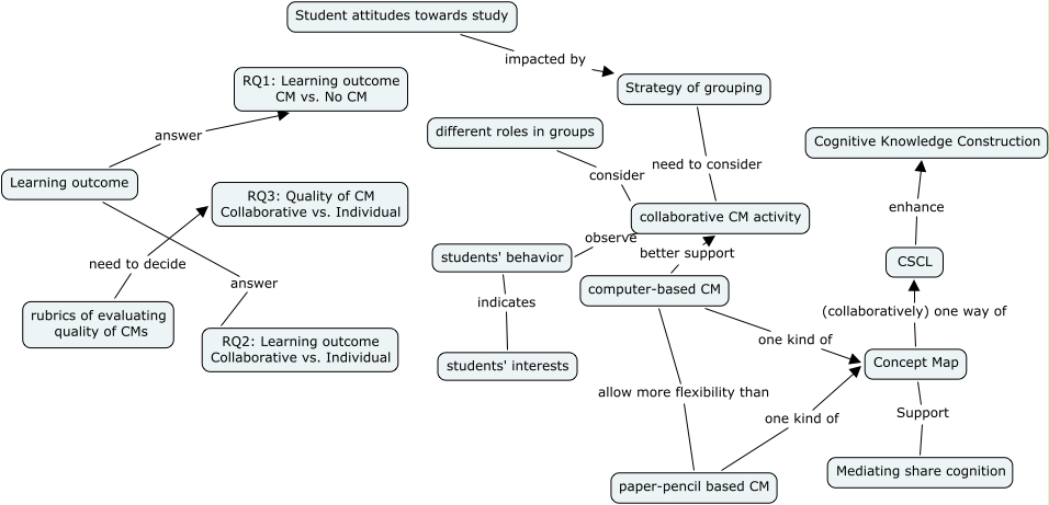 This Concept Map, created with IHMC CmapTools, has information related to: Group 3 concept map, Learning outcome answer RQ2: Learning outcome Collaborative vs. Individual, students' behavior indicates students' interests, Concept Map Support Mediating share cognition, different roles in groups consider collaborative CM activity, paper-pencil based CM one kind of Concept Map, Student attitudes towards study impacted by Strategy of grouping, collaborative CM activity observe students' behavior, computer-based CM one kind of Concept Map, computer-based CM better support collaborative CM activity, rubrics of evaluating quality of CMs need to decide RQ3: Quality of CM Collaborative vs. Individual, Strategy of grouping need to consider collaborative CM activity, CSCL enhance Cognitive Knowledge Construction, Concept Map (collaboratively) one way of CSCL, Learning outcome answer RQ1: Learning outcome CM vs. No CM, computer-based CM allow more flexibility than paper-pencil based CM