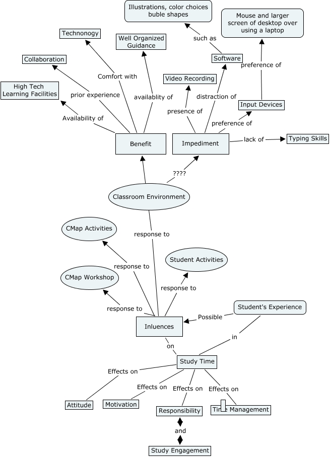 This Concept Map, created with IHMC CmapTools, has information related to: Group 6 CMap, Input Devices preference of Mouse and larger screen of desktop over using a laptop, Inluences response to CMap Activities, Student's Experience in Study Time, Study Time Effects on Time Management, Impediment preference of Input Devices, Benefit prior experience Collaboration, Inluences response to CMap Workshop, Inluences response to Benefit, Student's Experience Possible Inluences, Classroom Environment ???? Impediment, Impediment distraction of Software, Benefit Availability of High Tech Learning Facilities, Study Time Effects on Motivation, Impediment presence of Video Recording, Study Time Effects on Responsibility, Benefit Comfort with Technonogy, Benefit availablity of Well Organized Guidance, Study Time Effects on Attitude, Inluences on Study Time, Software such as Illustrations, color choices buble shapes