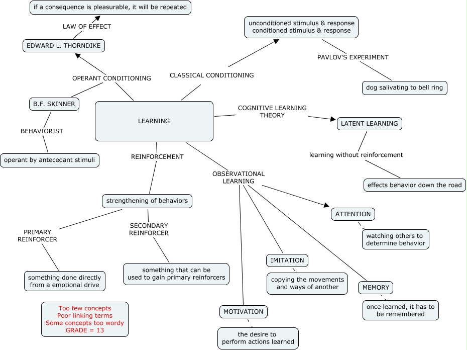 MATT MARCHMAN-Ch.5 Cmap-Section 166, B.F. SKINNER BEHAVIORIST operant by antecedant stimuli, LEARNING CLASSICAL CONDITIONING unconditioned stimulus & response conditioned stimulus & response, LEARNING OBSERVATIONAL LEARNING IMITATION, LEARNING OBSERVATIONAL LEARNING MOTIVATION, LEARNING OBSERVATIONAL LEARNING ATTENTION, MEMORY once learned, it has to be remembered, LEARNING OPERANT CONDITIONING EDWARD L. THORNDIKE, LEARNING OPERANT CONDITIONING B.F. SKINNER, MOTIVATION the desire to perform actions learned, EDWARD L. THORNDIKE LAW OF EFFECT if a consequence is pleasurable, it will be repeated