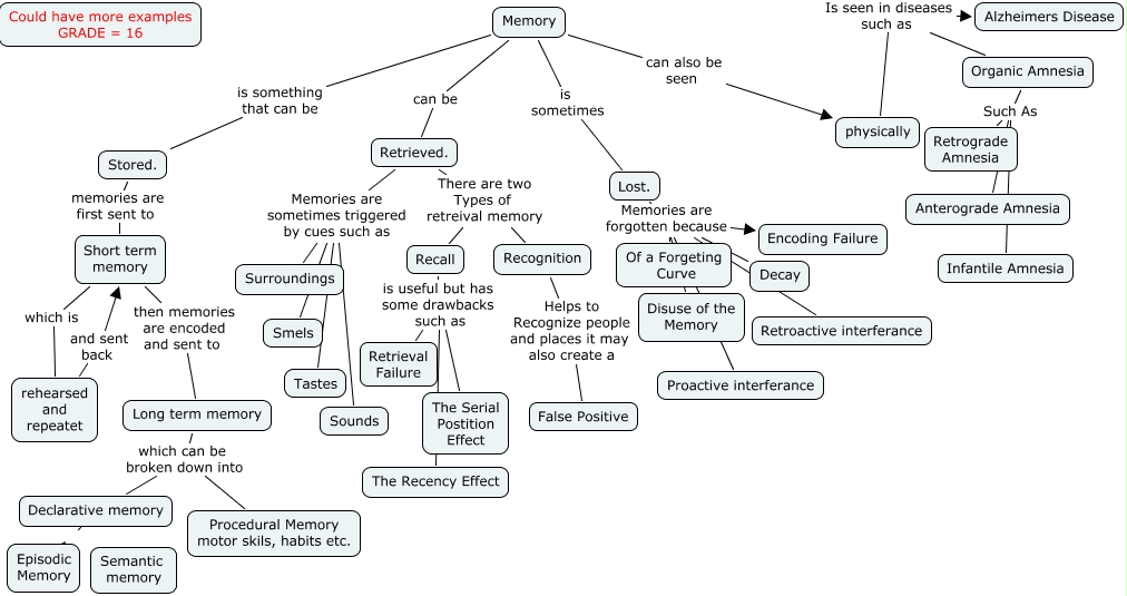 This Concept Map, created with IHMC CmapTools, has information related to: Rickie Fontenot CH 6, Short term memory then memories are encoded and sent to Long term memory, Memory is something that can be Stored., physically Is seen in diseases such as Alzheimers Disease, Lost. Memories are forgotten because Encoding Failure, Lost. Memories are forgotten because Disuse of the Memory, Memory is sometimes Lost., Recall is useful but has some drawbacks such as The Recency Effect, Organic Amnesia Such As Anterograde Amnesia, Recall is useful but has some drawbacks such as The Serial Postition Effect, Short term memory which is rehearsed and repeatet, Organic Amnesia Such As Retrograde Amnesia, Long term memory which can be broken down into Declarative memory, Lost. Memories are forgotten because Of a Forgeting Curve, Lost. Memories are forgotten because Retroactive interferance, Long term memory which can be broken down into Procedural Memory motor skils, habits etc., Recognition Helps to Recognize people and places it may also create a False Positive, Memory can also be seen physically, Retrieved. There are two Types of retreival memory Recognition, Lost. Memories are forgotten because Proactive interferance, Lost. Memories are forgotten because Decay