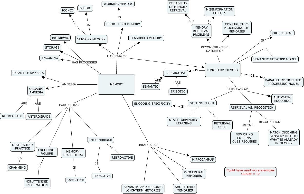 This Concept Map, created with IHMC CmapTools, has information related to: Samantha Kagarise ch6, DISTRIBUTED PRACTICE IS CRAMMING, MEMORY RETRIEVAL PROBLEMS ARE MISINFORMATION EFFECTS, MEMORY HAS STAGES LONG TERM MEMORY, MEMORY HAS STAGES SHORT TERM MEMORY, LONG TERM MEMORY IS PROCEDURAL, MEMORY HAS PROCESSES RETRIEVAL, ENCODING FAILURE IS NONATTENDED INFORMATION, LONG TERM MEMORY IS PARALLEL DISTRIBUTED PROCESSING MODEL, SENSORY MEMORY IS ECHOIC, RETRIEVAL VS. RECOGITION RECALL FEW OR NO EXTERNAL CUES REQUIRED, MEMORY BRAIN AREAS SHORT-TERM MEMORIES, MEMORY FORGETTING MEMORY TRACE DECAY, MEMORY FORGETTING INTERFERENCE, INTERFERENCE IS PROACTIVE, LONG TERM MEMORY RETRIEVAL OF RETRIEVAL VS. RECOGITION, MEMORY FORGETTING DISTRIBUTED PRACTICE, INTERFERENCE IS RETROACTIVE, MEMORY FORGETTING ENCODING FAILURE, SHORT TERM MEMORY IS WORKING MEMORY, DECLARATIVE ARE EPISODIC