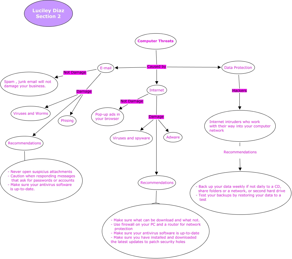 This Concept Map, created with IHMC CmapTools, has information related to: Luciley Diaz, E-mail Damage Viruses and Worms, Internet Not Damage Pop-up ads in your browser, Recommendations ???? - Never open suspicius attachments - Caution when responding messages that ask for passwords or accounts - Make sure your antivirus software is up-to-date., Internet Damage Recommendations, Recommendations ???? ????, Internet Damage Viruses and spyware, Internet intruders who work with their way into your computer network Recommendations - Back up your data weekly if not daily to a CD, share folders or a network, or second hard drive - Test your backups by restoring your data to a test, Internet Damage Adware, Data Protection Hackers Internet intruders who work with their way into your computer network, E-mail Not Damage Spam , junk email will not damage your business., E-mail Damage Phising, Computer Threats Caused by Data Protection, Computer Threats Caused by E-mail, Computer Threats Caused by Internet, E-mail Damage Recommendations
