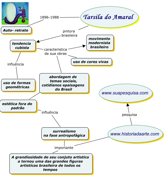 Esse mapa conceitual, produzido no IHMC CmapTools, tem a informação relacionada a: Tarsila do Amaral, surrealismo na fase antropofágica importante A grandiosidade de seu conjuto artistico a tornou uma das grandes figuras artistícas brasileira de todos os tempos, tendencia cubista caracteristica de sua obras movimento modernista brasileiro, Tarsila do Amaral 1896-1988 Auto- retrato, abordagem de temas sociais, cotidianos epaisagens do Brasil ???? estética fora do padrão, Tarsila do Amaral pintora brasileira tendencia cubista, surrealismo na fase antropofágica importante ????, uso de cores vivas caracteristica de sua obras abordagem de temas sociais, cotidianos epaisagens do Brasil, ???? pesquisa www.suapesquisa.com, tendencia cubista influência uso de formas geométricas, uso de cores vivas caracteristica de sua obras movimento modernista brasileiro, estética fora do padrão influência surrealismo na fase antropofágica, tendencia cubista caracteristica de sua obras abordagem de temas sociais, cotidianos epaisagens do Brasil