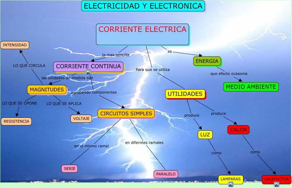 Este Cmap, tiene información relacionada con: ELECTRICIDAD Y ELECTRONICA, CORRIENTE ELECTRICA la mas sencilla CORRIENTE CONTINUA, CALOR como CALEFACTOR, UTILIDADES produce LUZ, CIRCUITOS SIMPLES en el mismo ramal SERIE, UTILIDADES produce CALOR, MAGNITUDES LO QUE SE APLICA VOLTAJE, CORRIENTE CONTINUA las unidades de medida son MAGNITUDES, LUZ como LAMPARAS, CIRCUITOS SIMPLES en diferntes ramales PARALELO, CORRIENTE ELECTRICA Para que se utiliza UTILIDADES, MAGNITUDES LO QUE SE OPONE RESISTENCIA, MAGNITUDES LO QUE CIRCULA INTENSIDAD, CORRIENTE CONTINUA agrupando componentes CIRCUITOS SIMPLES, ENERGIA que efecto ocasiona MEDIO AMBIENTE, CORRIENTE ELECTRICA es ENERGIA